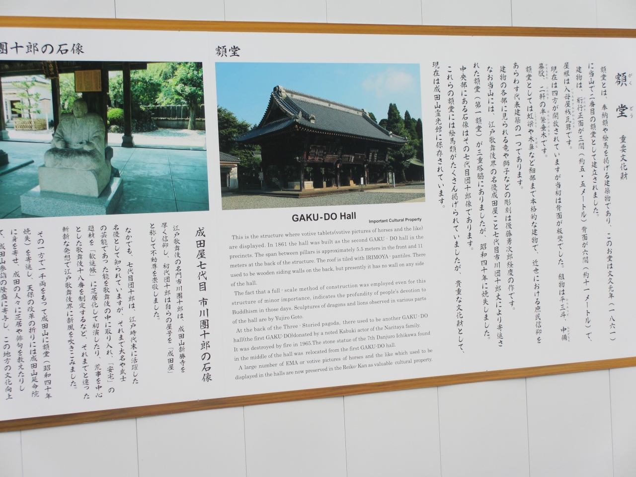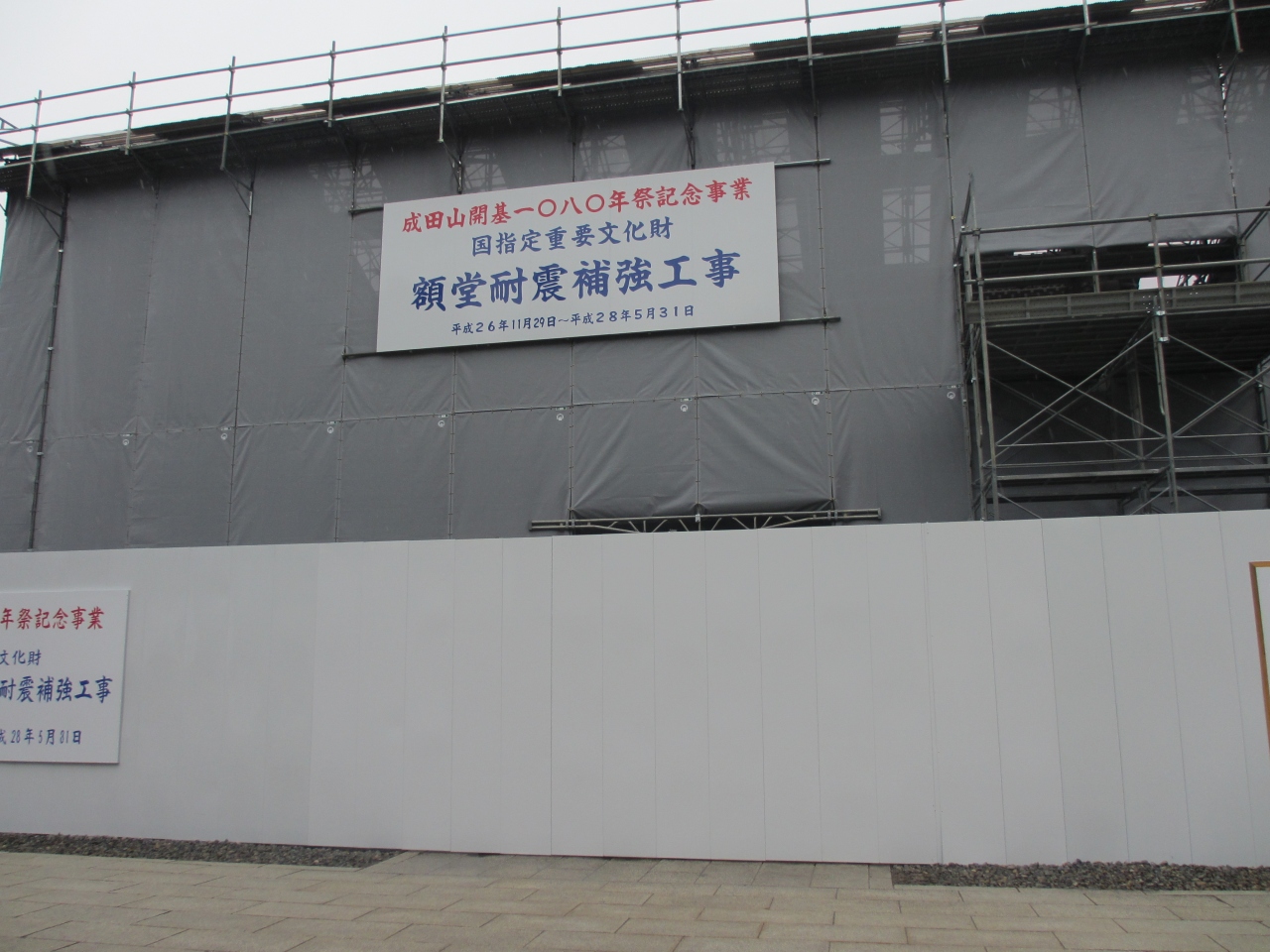 今回新勝寺を訪れた私のテーマは本堂以外も見るということでした。こちらは、歴史ある建物とのことで見るのを楽しみにしていたのですが、現在は耐震補強工事中のため、写真のように足場やシートで覆われてしまっています。平成28年5月31日まで工事が続くと表示されていました。
