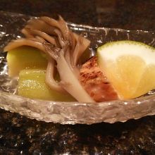 一年中、松茸を食べられる赤坂「松葉屋」で修行された青木料理長が手ずから焼いてくれる松茸一本焼きのほか、鮑の踊り焼きや鯨の尾の身など、他所では中々食べられないものも。