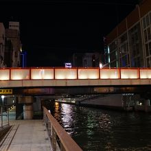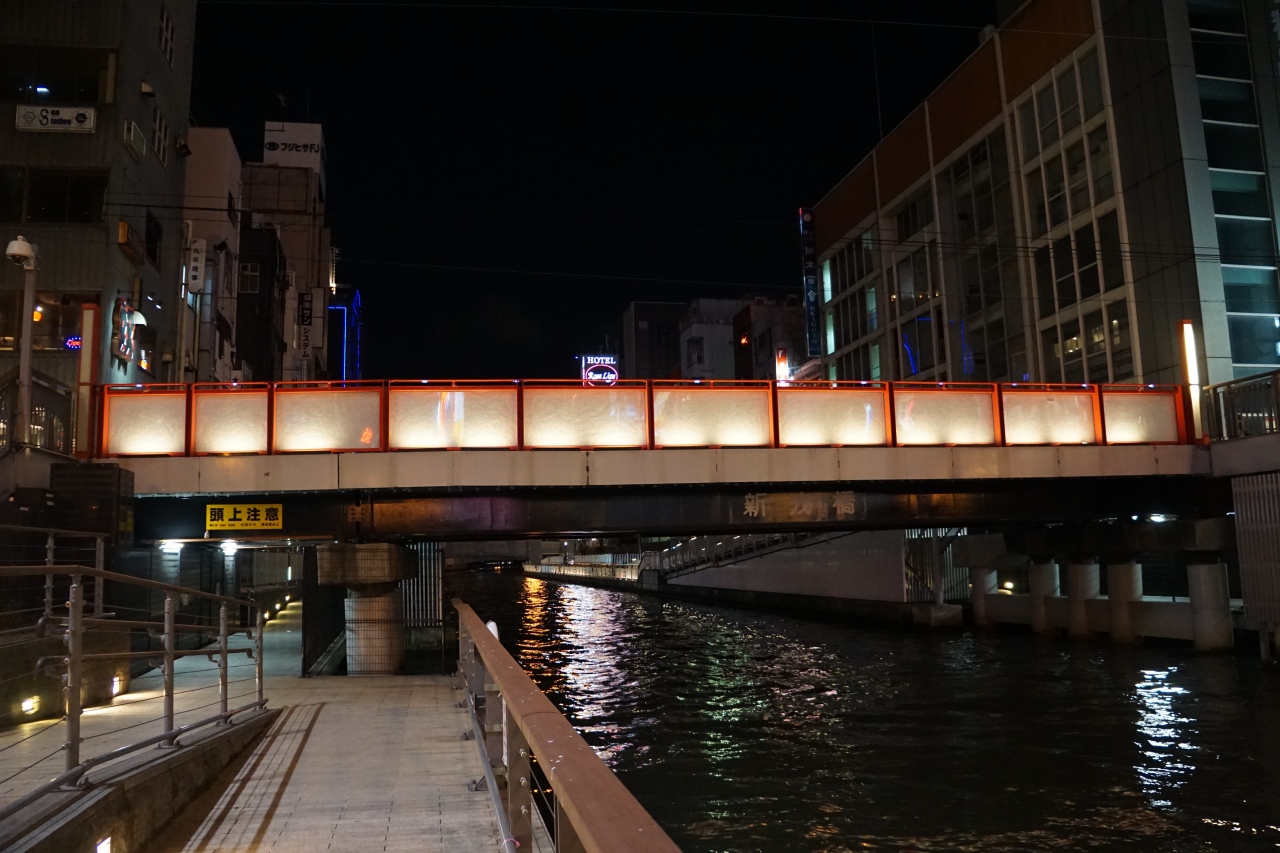 新戎橋は、戎橋と御堂筋を挟んだ反対側。リバーウオークを行くとすぐです。和紙を挟み込んだガラスと赤い枠がネオンのように光っていて、ちょっと独特の美しさがありますね。この感じは、夜にならないと分かりません。夜を彩る橋でしょう。