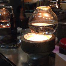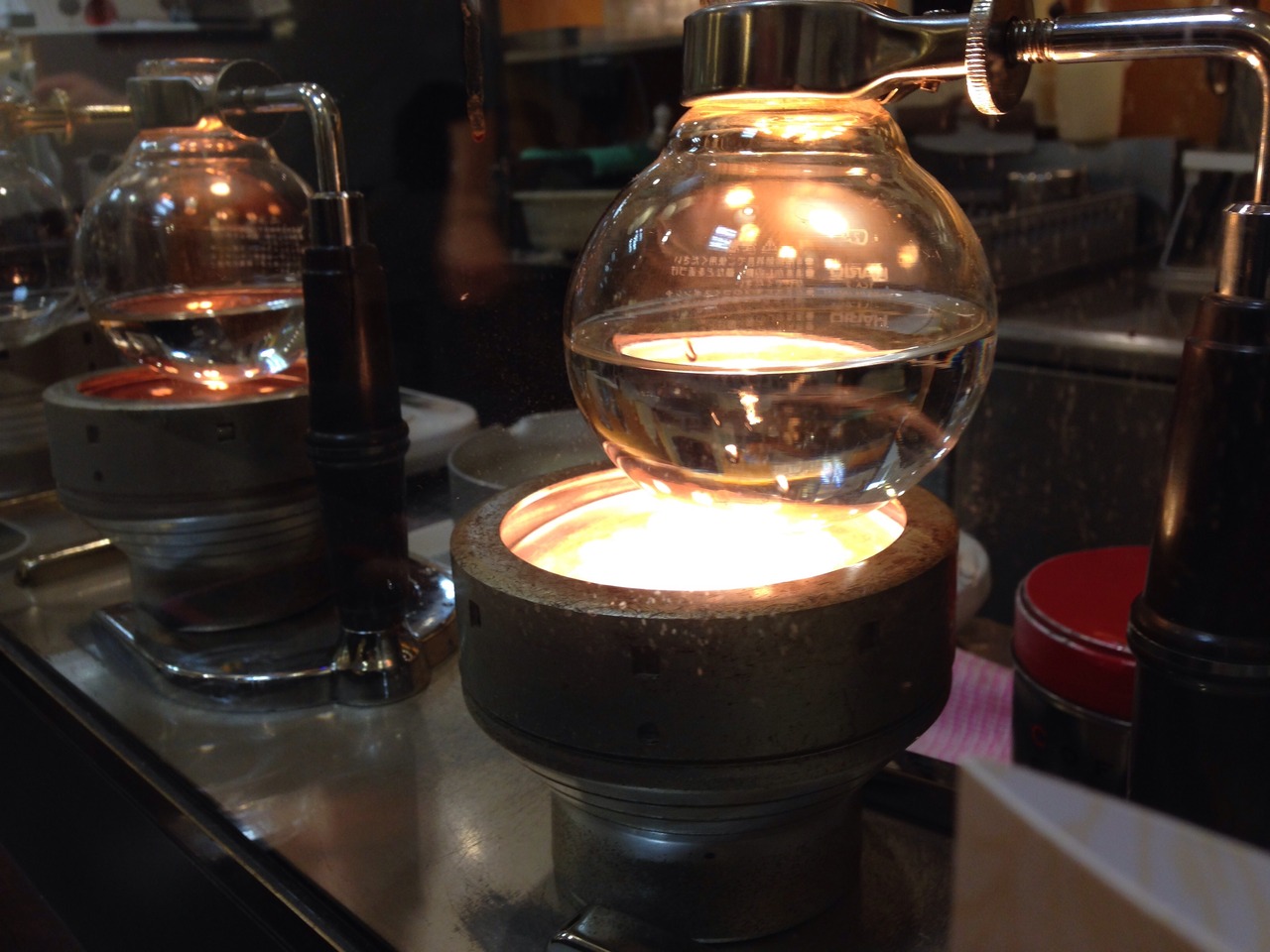 鳥取大丸の地下1階にある落ち着いた雰囲気のある喫茶店。地下にある店舗ですが、店舗の奥半分が喫煙可能です。さらに消防法のためガスが使えないため、白熱灯を使ってサイフォンのお湯を沸かしているところが独特ですね。