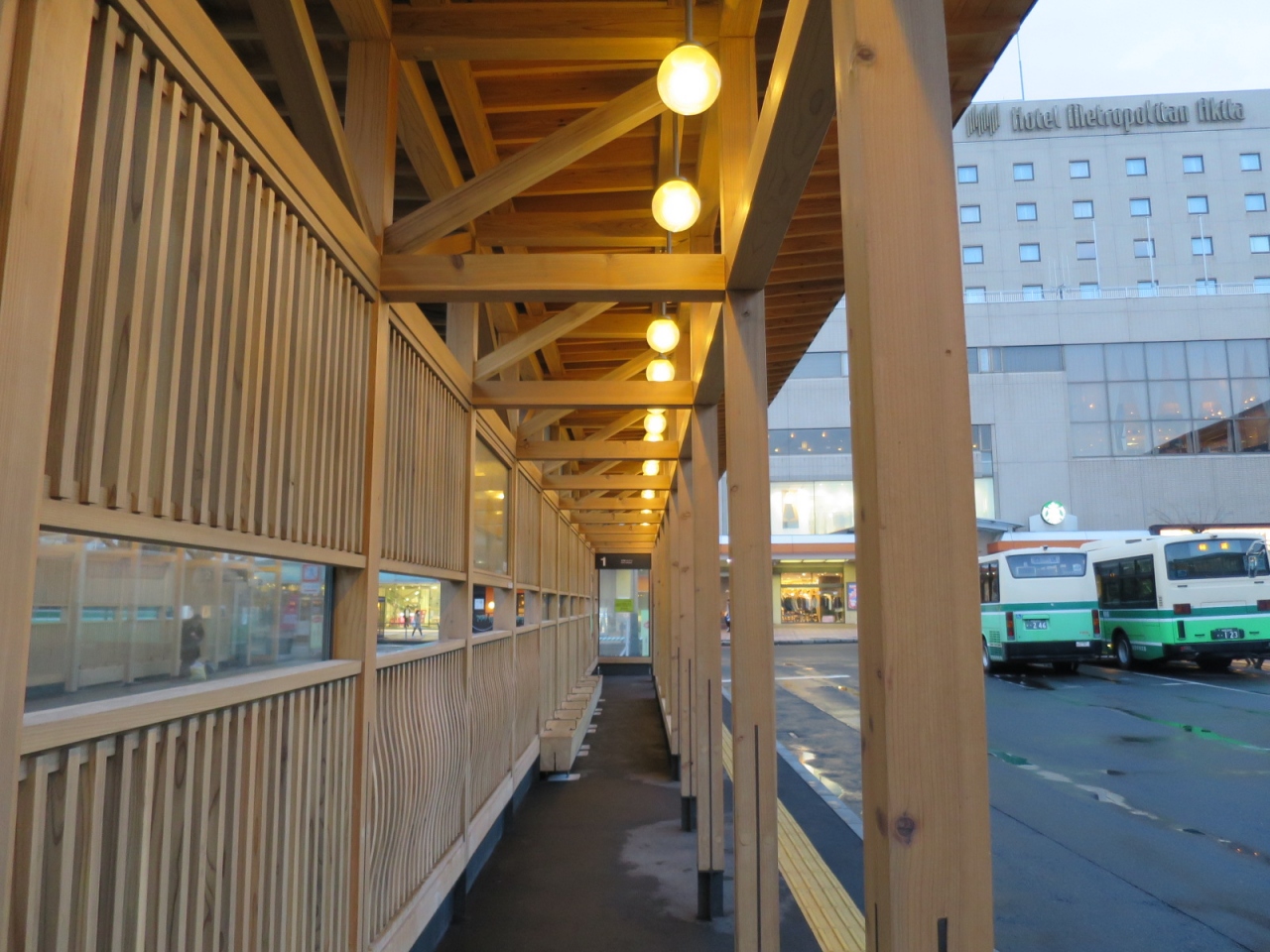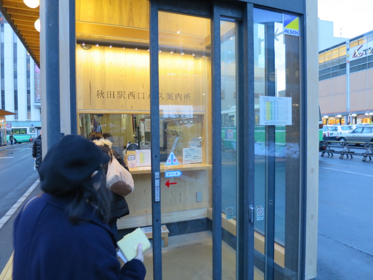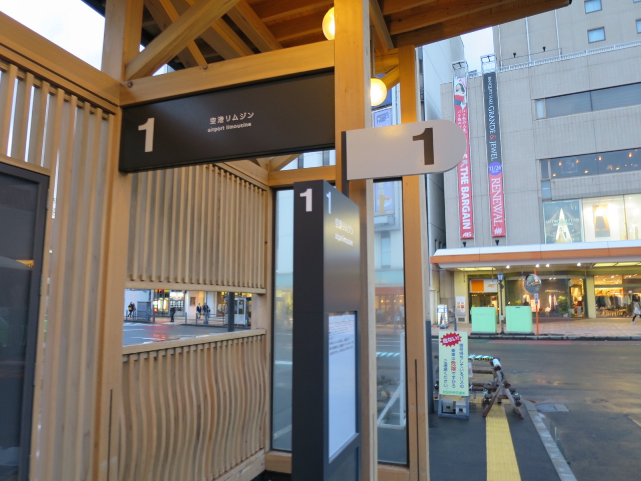 秋田駅には東西両口にバスターミナルがありますが、メインの西口の方です。1番線出発という好位置から出ますが、結局はロータリーの真ん中まで横断歩道を渡って乗り場へ向います。乗り場は空港行きですが、降車用の別のバスが時々停まります。
