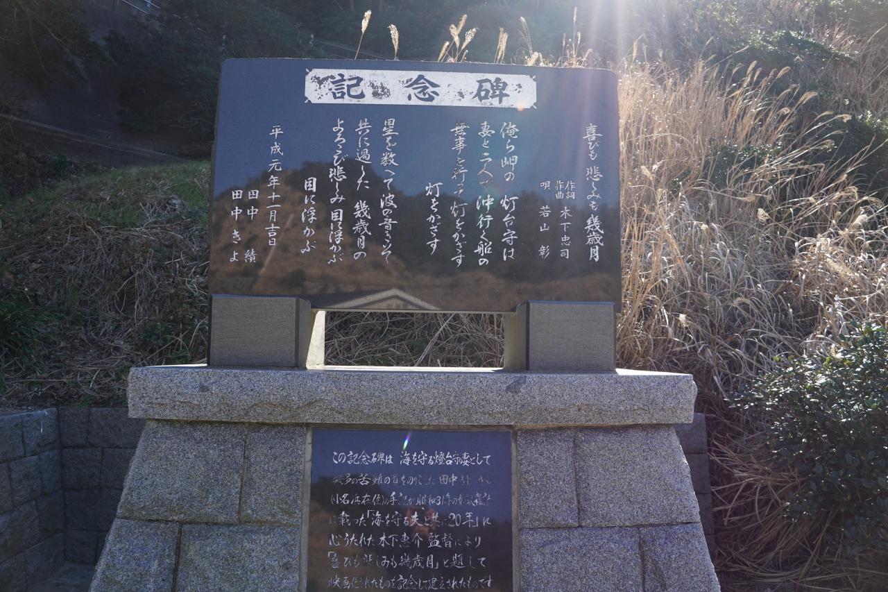 喜びも悲しみも幾歳月の記念碑は、塩谷崎灯台に登る登り口。ここでは、美空ひばりの歌碑に人気があるので、この記念碑の気が付く人は少ないかもしれません。