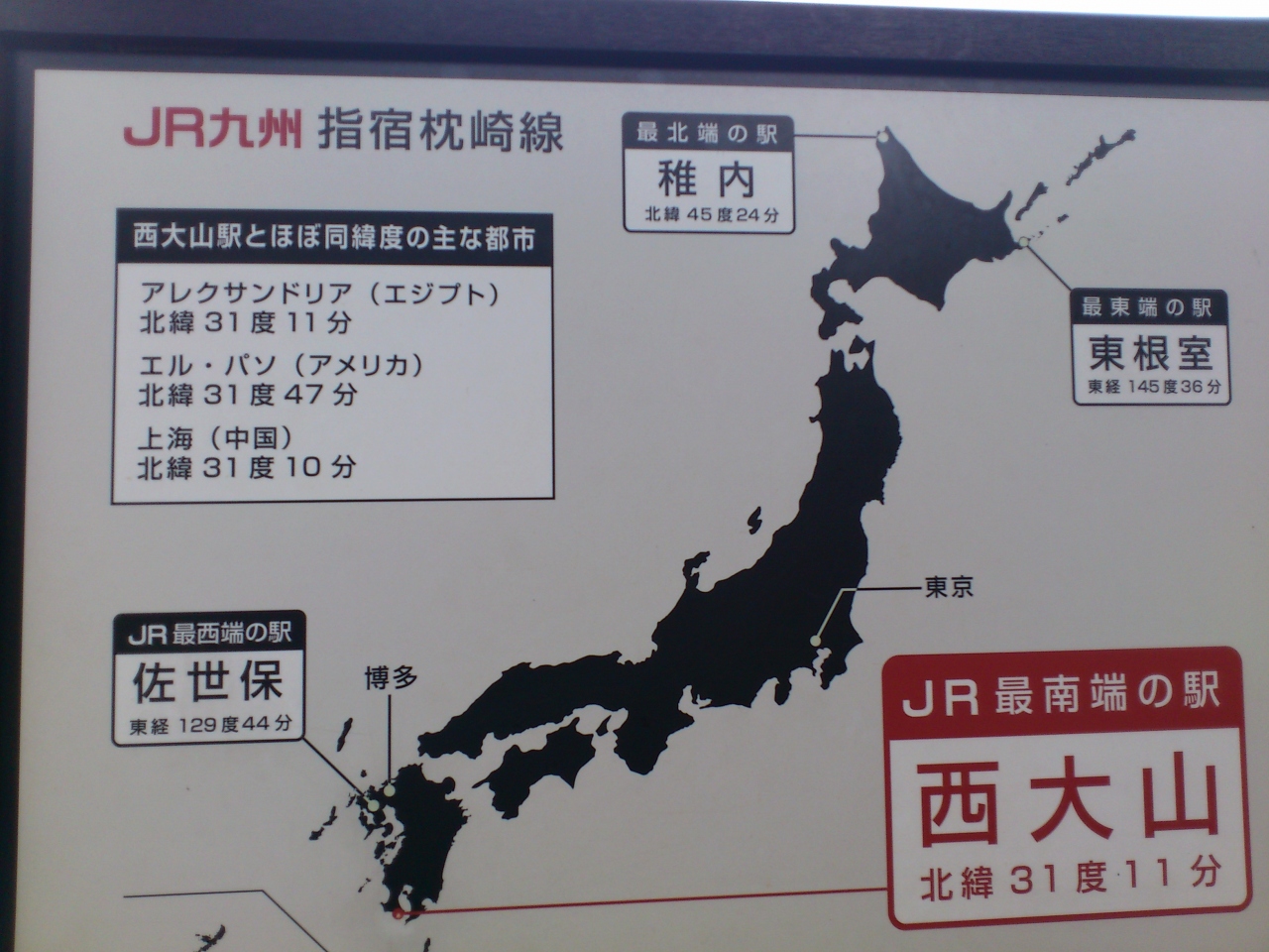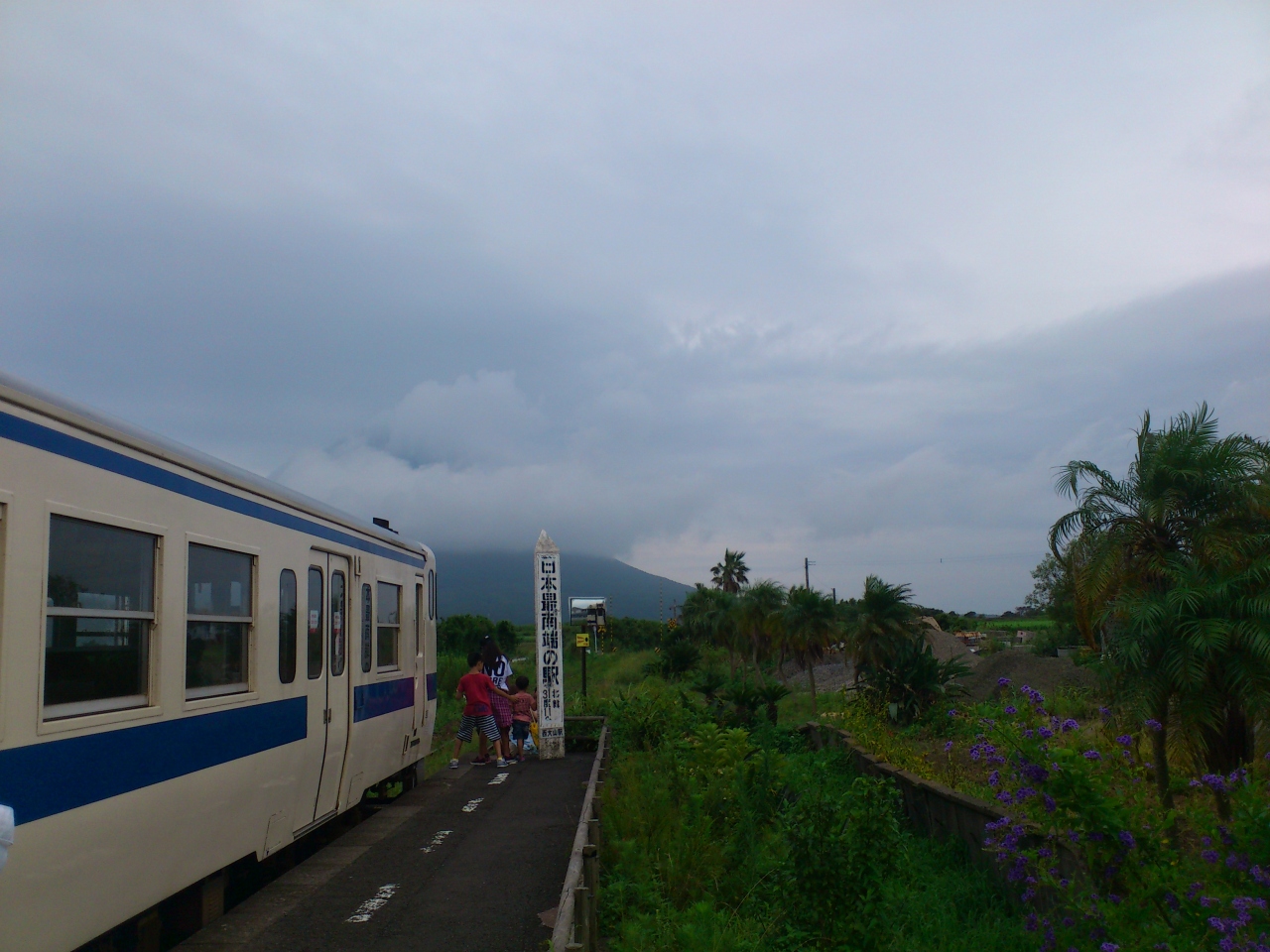 開聞駅から指宿駅に戻る際に西大山駅で2分ほど停車してくれて,開聞岳や案内板の写真を撮ることができました.他の駅と同様に田畑が広がる風景ですが,駅前に店があり,夏休みであったためか乗客数が多かったです.