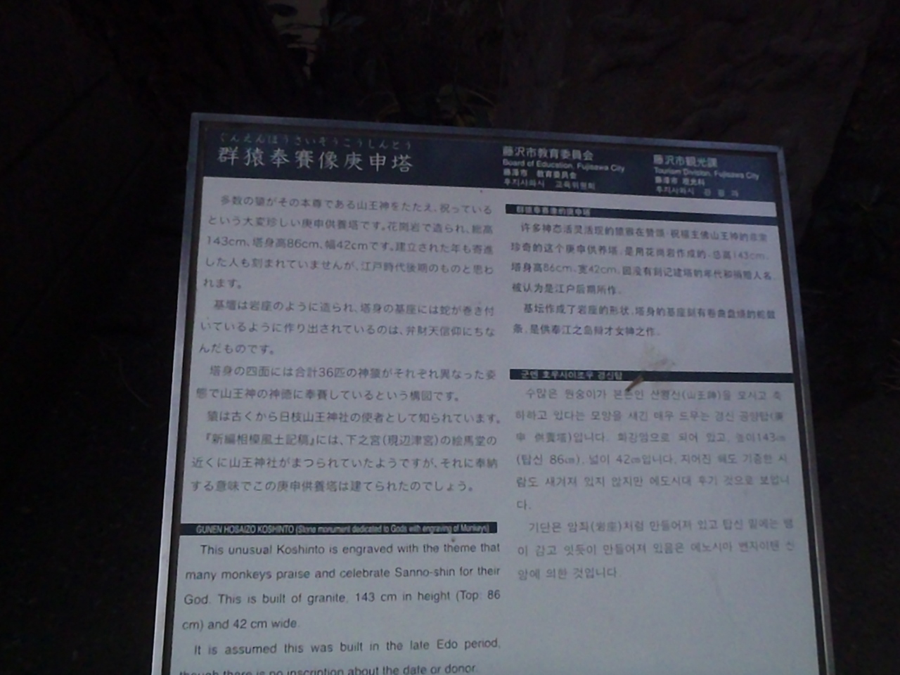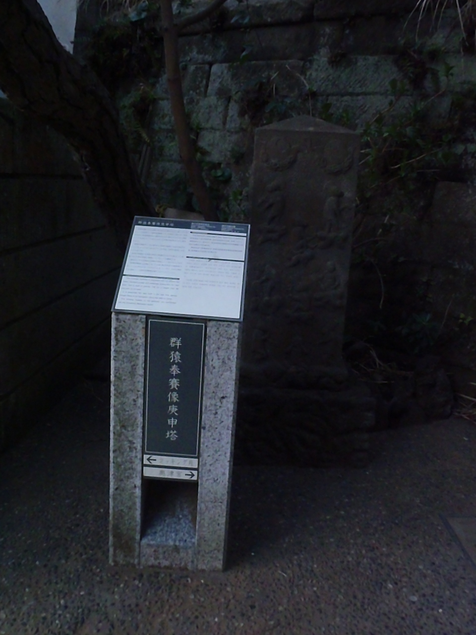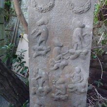 烏帽子をかぶって扇を持つサルの姿はとてもユーモラスで案内板によると石碑四面に36もの姿が刻まれているということです。