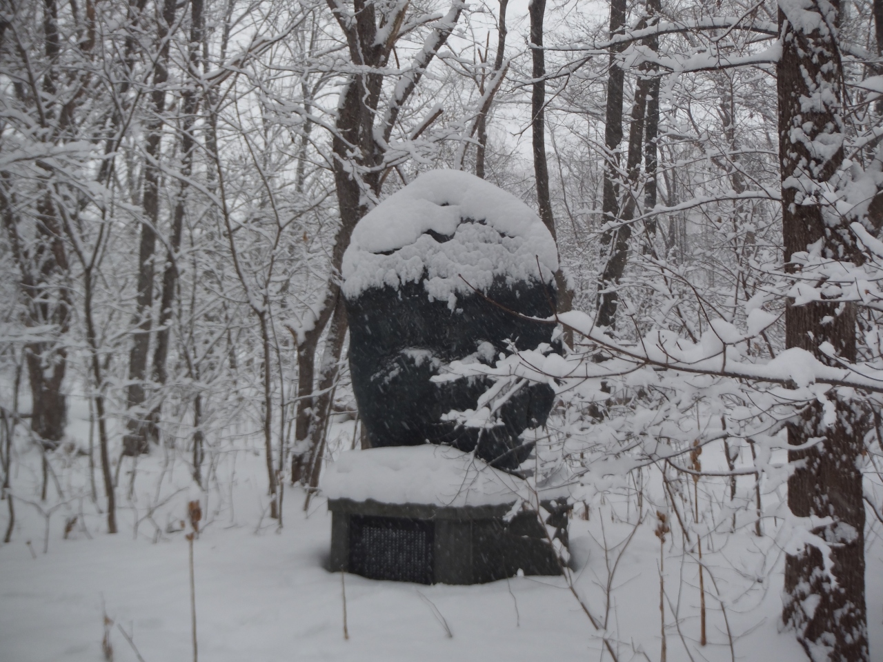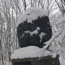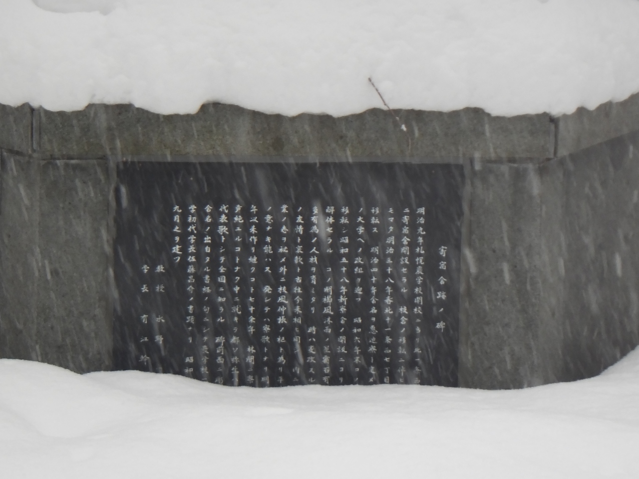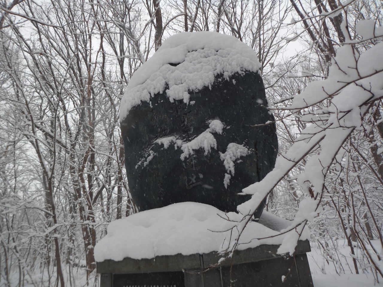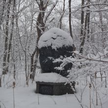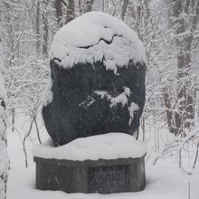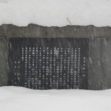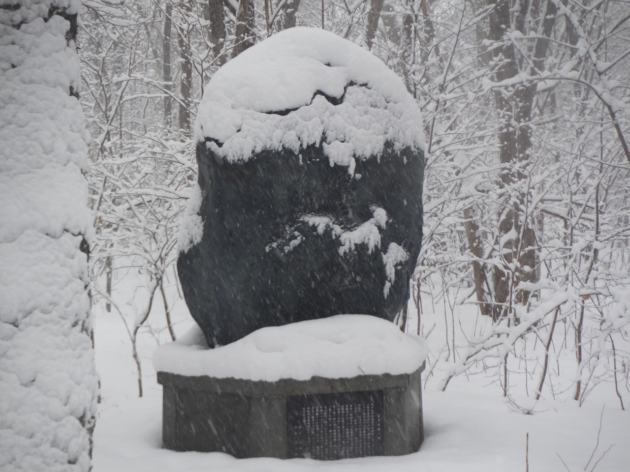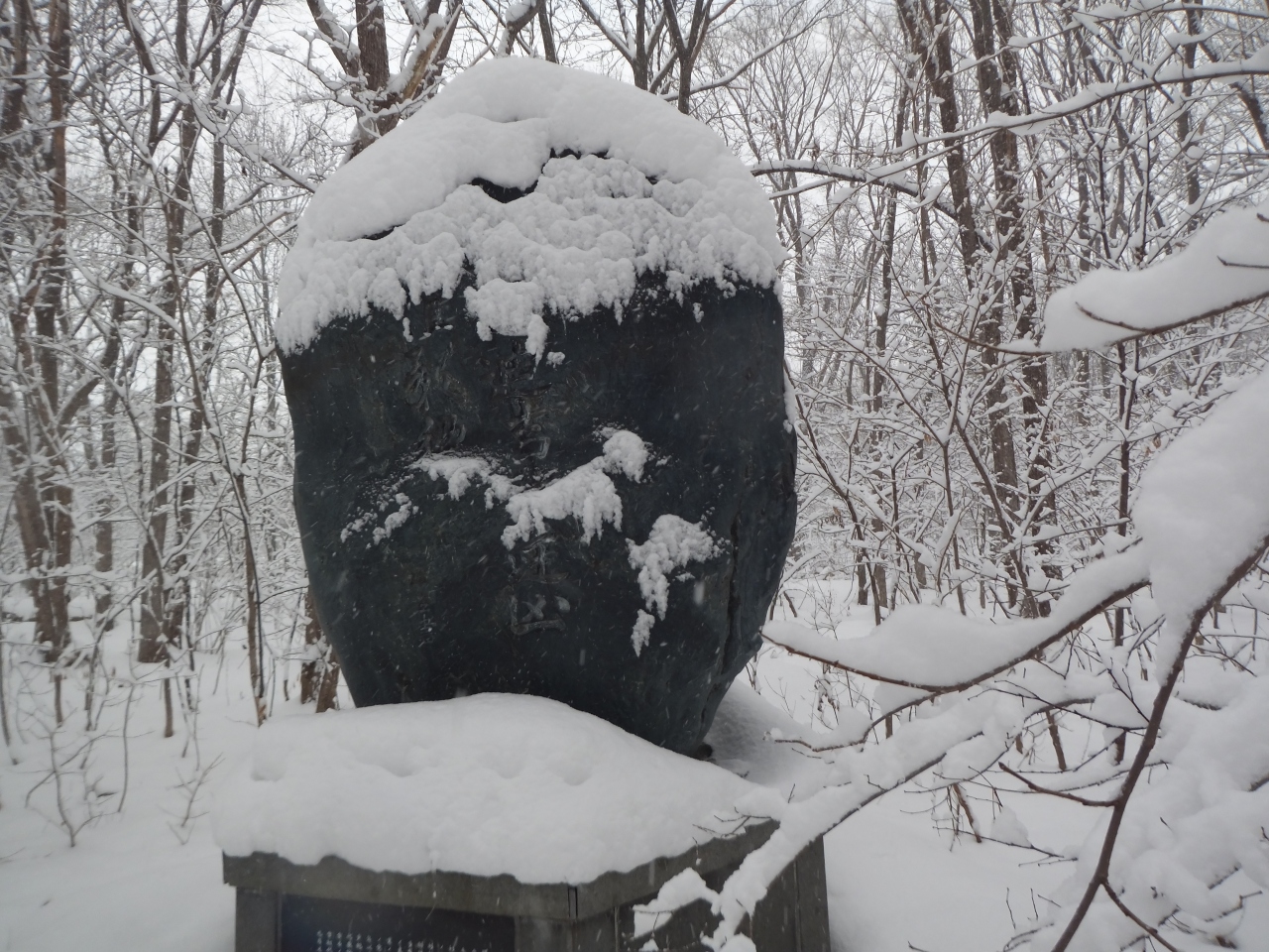 訪れた時は、雪が降り積もる白銀の世界。碑は道沿いなのですが、樹林に隠れるようにひっそりと立っていました。緑の時期も良さそうですが、白い雪に覆われた木々の中を行くのも雪国でない人間には新鮮です。おつな散歩を楽しむ旅人を、静かに雪片舞う樹林から碑が眺めていました。