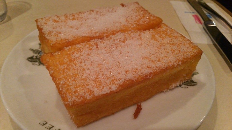 フレンチトーストは、巷で流行っているようなものではなく、グラニュー糖をまぶした揚げパンのような。