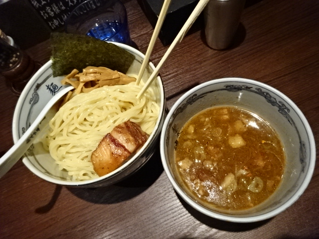 神田の飲み屋街の一角にあります。カウンターだけの店ですが、ラーメン屋さんはこれが定番かもしれません。つけ麺のみせですが、麺は太麺で味付け肉が麺のどんぶりに入ってきます。スープは魚貝系でこってりしています。麺とスープが良くマッチングしています。麺は大・中・小とありますが、大でもすぐに食べきってしまいます。やはり、おいしいのでしょうね。