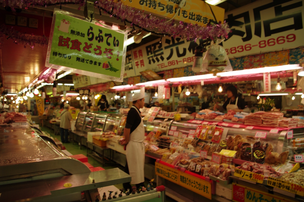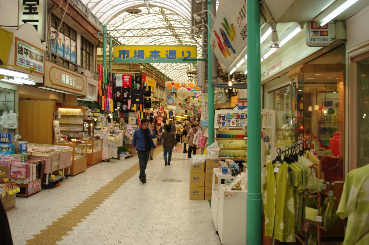 車は通らず、お土産屋さんが多い国際通りよりも、果物や魚、着物やお菓子などを販売しているお店が多い。また、少し進むと第一牧志公設市場があり、珍しい魚や海葡萄をはじめ、豚など様々な沖縄特有の市場は見るだけで楽しいので立ち寄ってみてください。