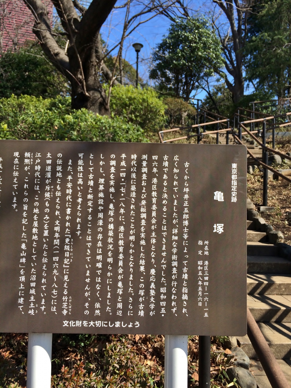 小高い山のような塚です、階段を使って頂上まで登れました。頂上は以外に広くて亀塚とその由来が書かれた説明板がありました。