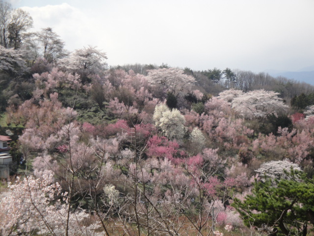 ツアーなので、連れて行かれるがままにバスに乗っていました。混雑する人ごみを歩いて上に登ってい見ると・・・・えも言わぬ景色。桜は一本一本を眺めるのもいいですが、遠くから桜の山を見るのも乙なものです。少しずつ色がわかっていて、よく手入れされているなと感心しました。