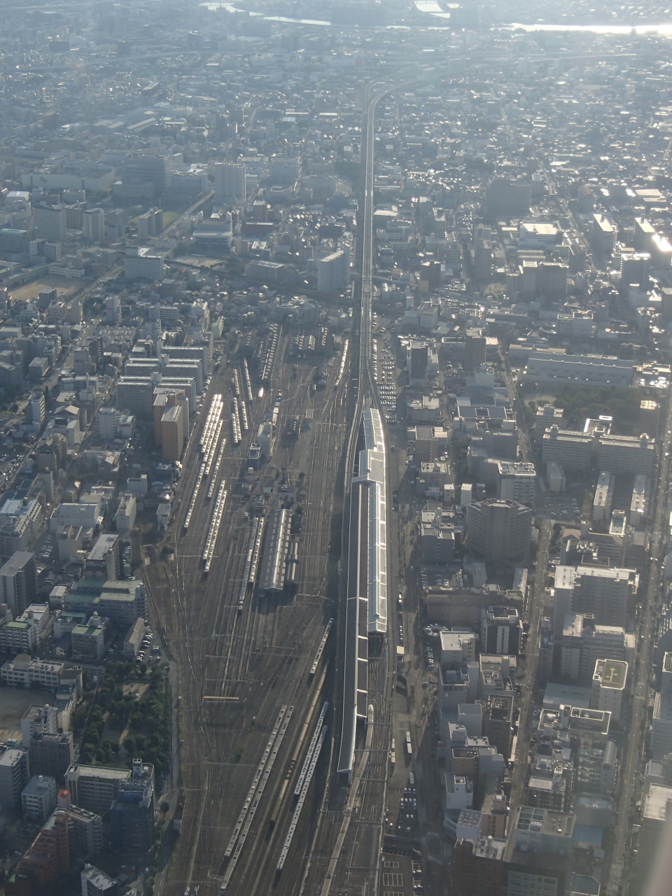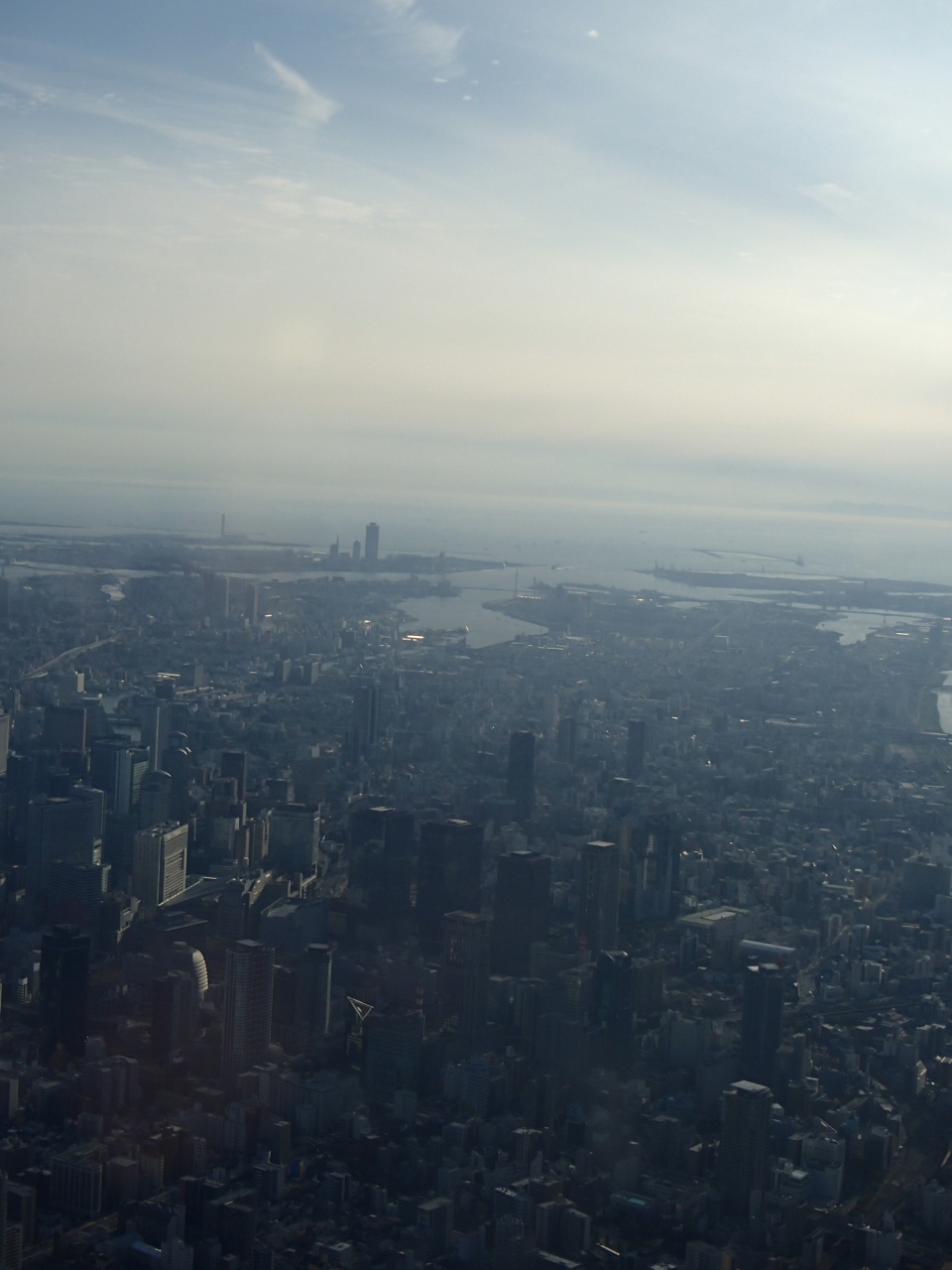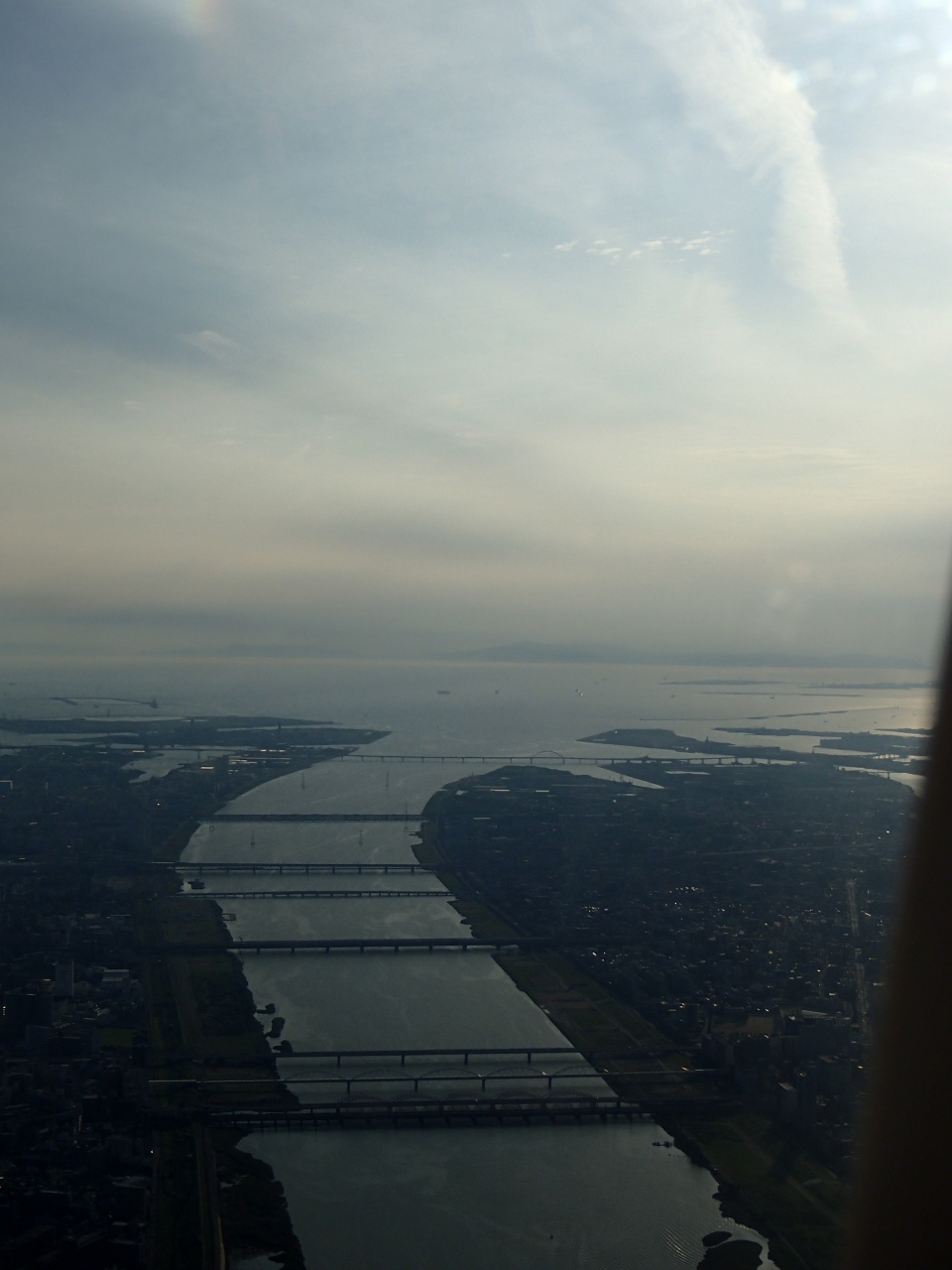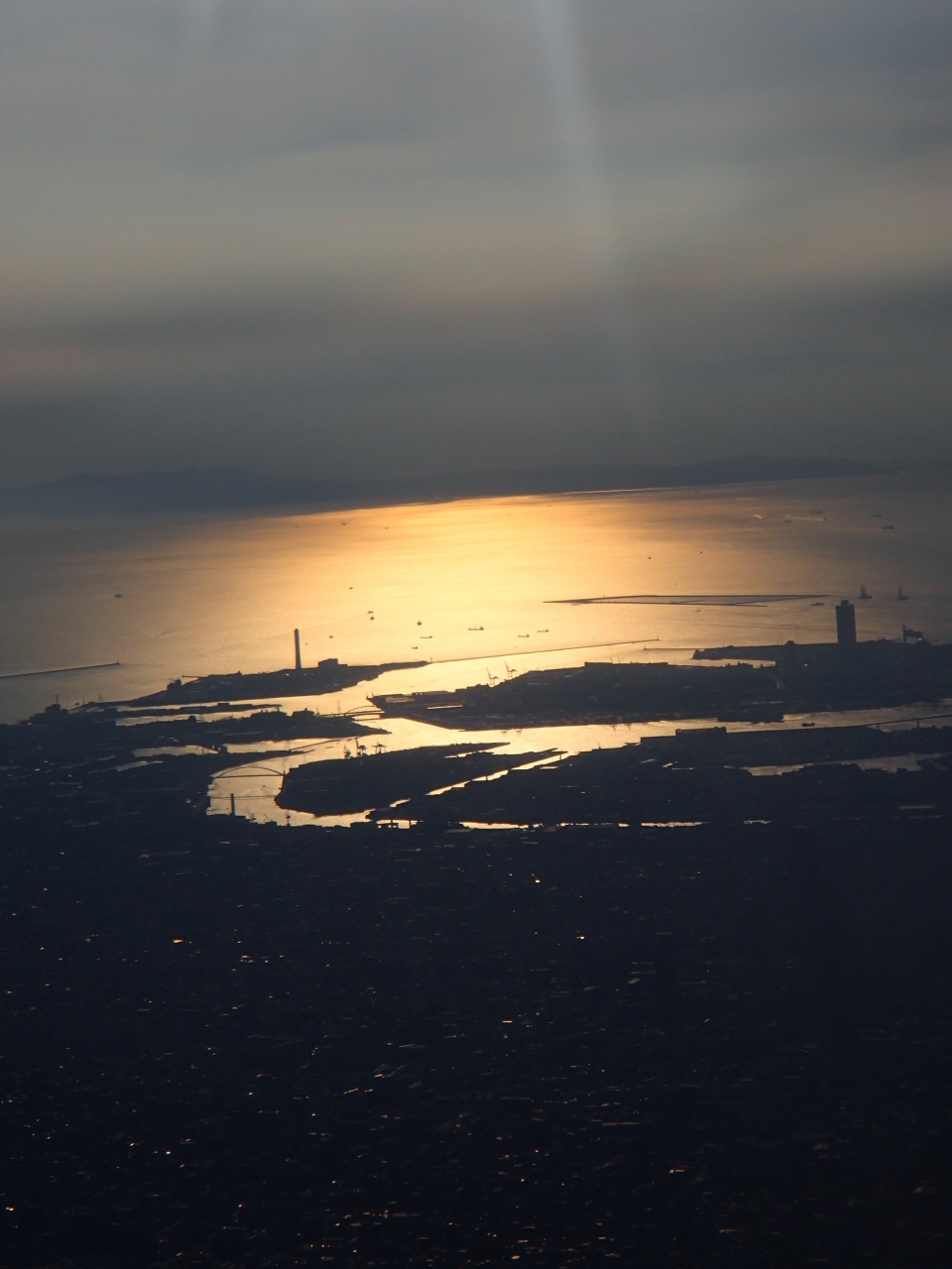 着陸入線路が南東側からと決まっているので、大阪府上空に入ってからは左側に大阪市内のビル群や大阪湾の風景が見られます。
