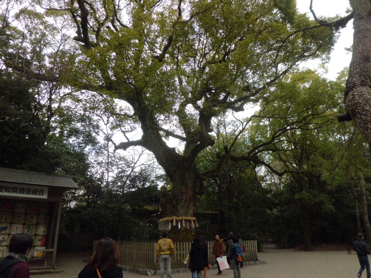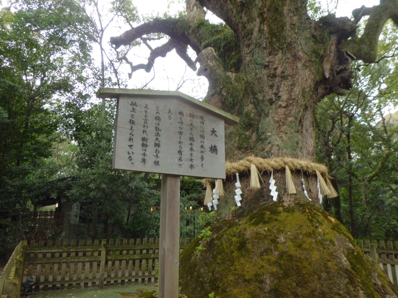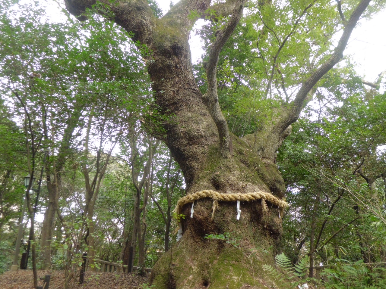 境内には7本の大楠があるそうですが、2本しか確認しませんでした。本殿の手前にある大楠がメインとなり、柵で囲われ、しめ縄が巻かれています。中に住む蛇のために卵が供えられています(ボランティアの方が説明していました)。もう一本は、こころの小径にあり、こちらもしめ縄が巻かれています。