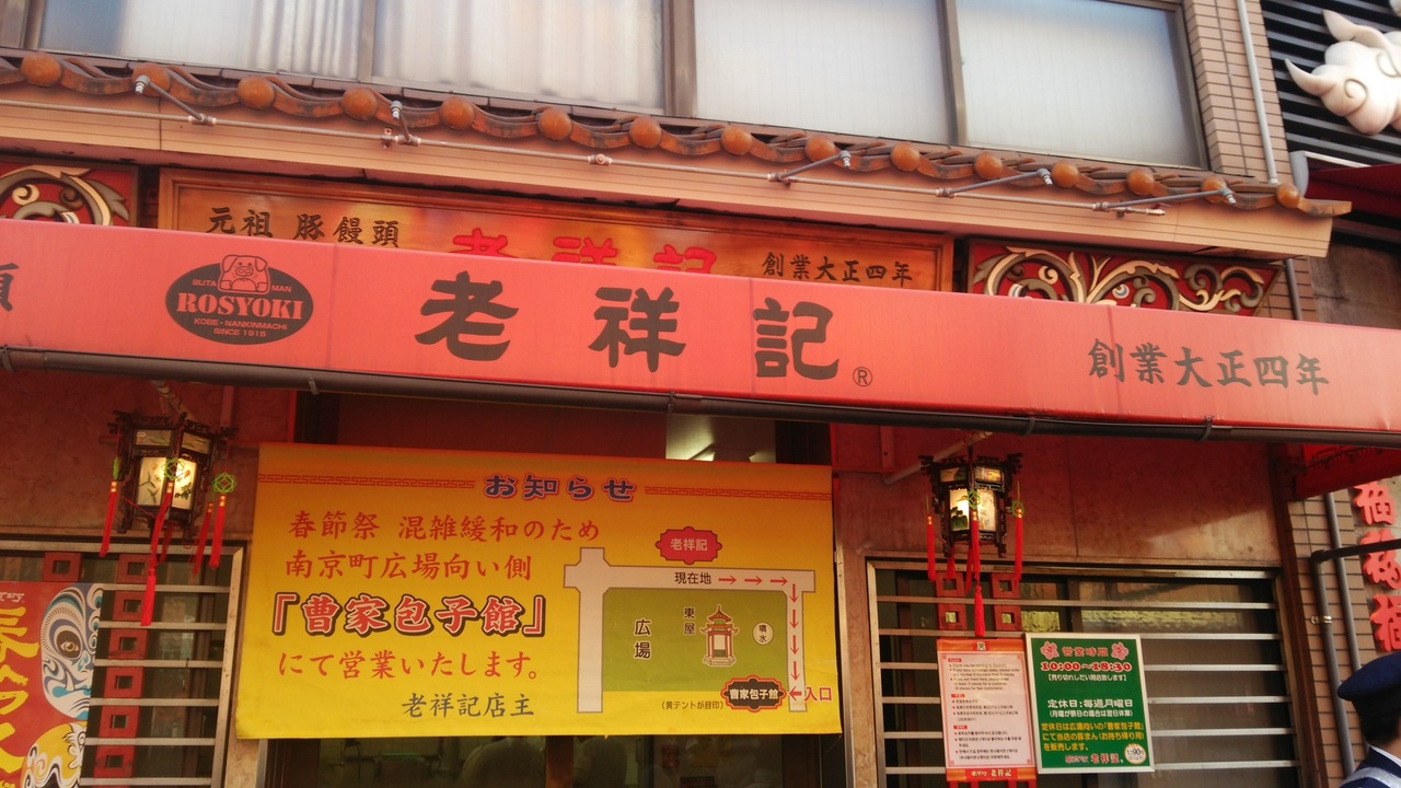 南京町の中央広場前の豚まんの有名店で、いつもたくさんのお客さんが並んでいます。