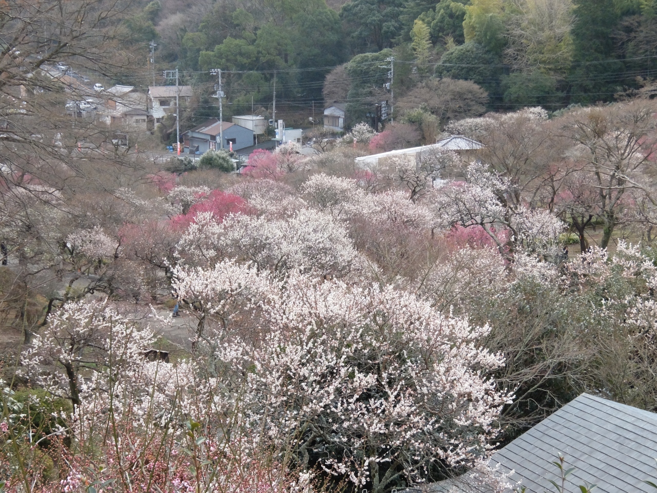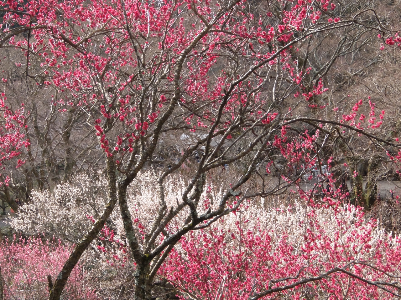 タイミングよく熱海の梅林は満開である。早くいかないと駐車場が満杯になりますとのことで、9時には出たが、すでに満杯。梅林に沿って上に上ったところに、500円の駐車場があり、まだ早かったので、何とか滑り込みセーフであった。上の入り口から入場。熱海ん位泊まると、その領収書で、300円が100円に値引き。しゃれた計らいである。ウメは本当に満開。絶好調。