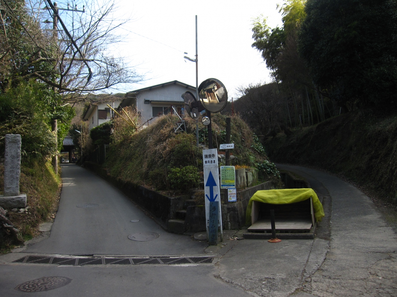 瑞泉寺の入り口辺りまで来ると二股に道が別れていて、看板には「車は直進・歩きの方は右の道を(のたくったような字で)」って感じで書かれているので