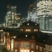電気のついた東京駅舎と後ろの高層ビルがキラキラして、とても綺麗に見えます。