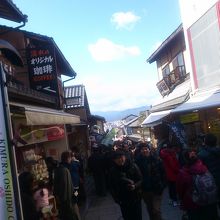 清水寺に行くには、茶わん坂とこの清水坂の2つのルートがあります。行きは空いている茶わん坂で登って来たので、帰りはこの清水坂を経由して、三年坂・二年坂を通って八坂神社へ行くルートを選択。左右に土産物屋さんが並び、登ってくる観光客とすれ違いになり、物凄い混雑でした。