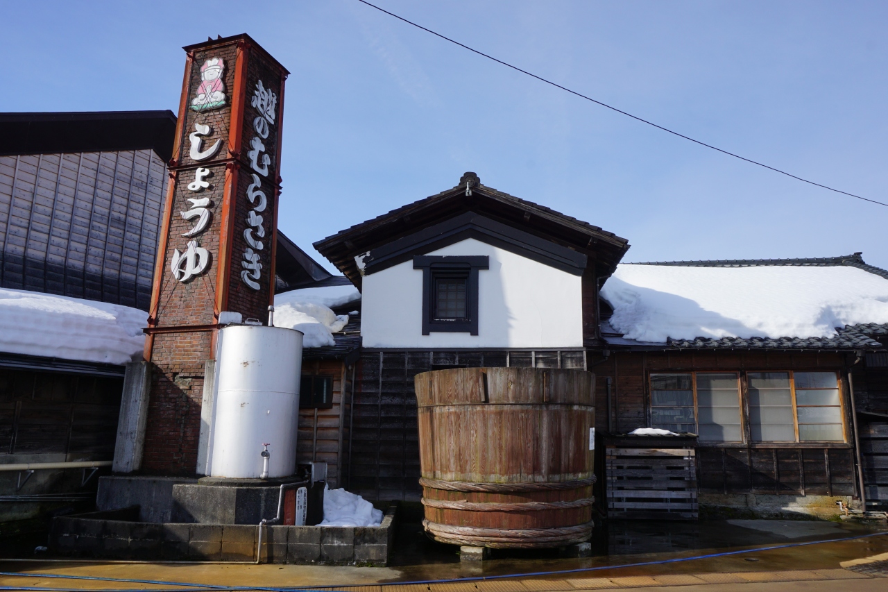 越のむらさきは、醸造の街、摂田屋の中心部にある醤油屋さん。大きな煉瓦の煙突に「越のむらさき」と書いてあって、それが看板となっています。ここは三国街道の入口で、玄関先には、道しるべのお地蔵さんや稲荷神社の祠があって、ちょっと雰囲気のある一角となっています。