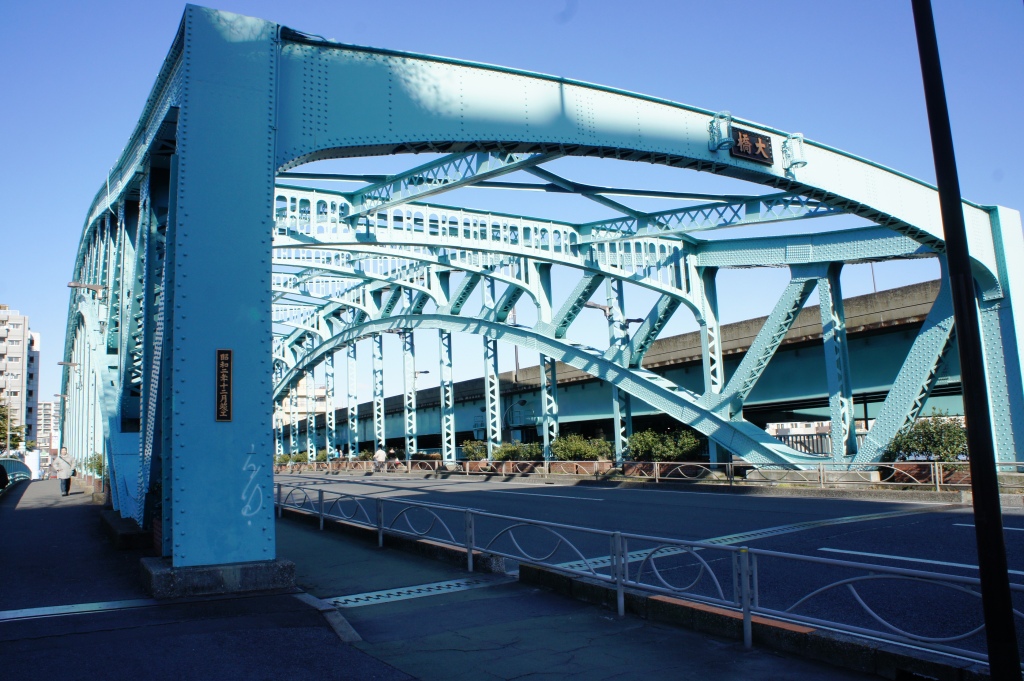 隅田川をまたいで南千住と北千住をつなぐ千住大橋。水色に塗られたとってもオールドな雰囲気の橋でした。日光街道、奥羽街道をひきつぐ国道4号の下り線が走っていました。1594年、徳川家康が江戸に入ってきて初めて造ったのが千住橋で江戸の北の玄関口として歌川広重も描いているとのこと。現在の橋は1927年築。歴史的な土木構造物として注目されているそうですが、確かにこういう橋ってあまり見かけないなあと思います。上り線はどこでも見かける現代の橋。あーなったら、つまんないなあ。