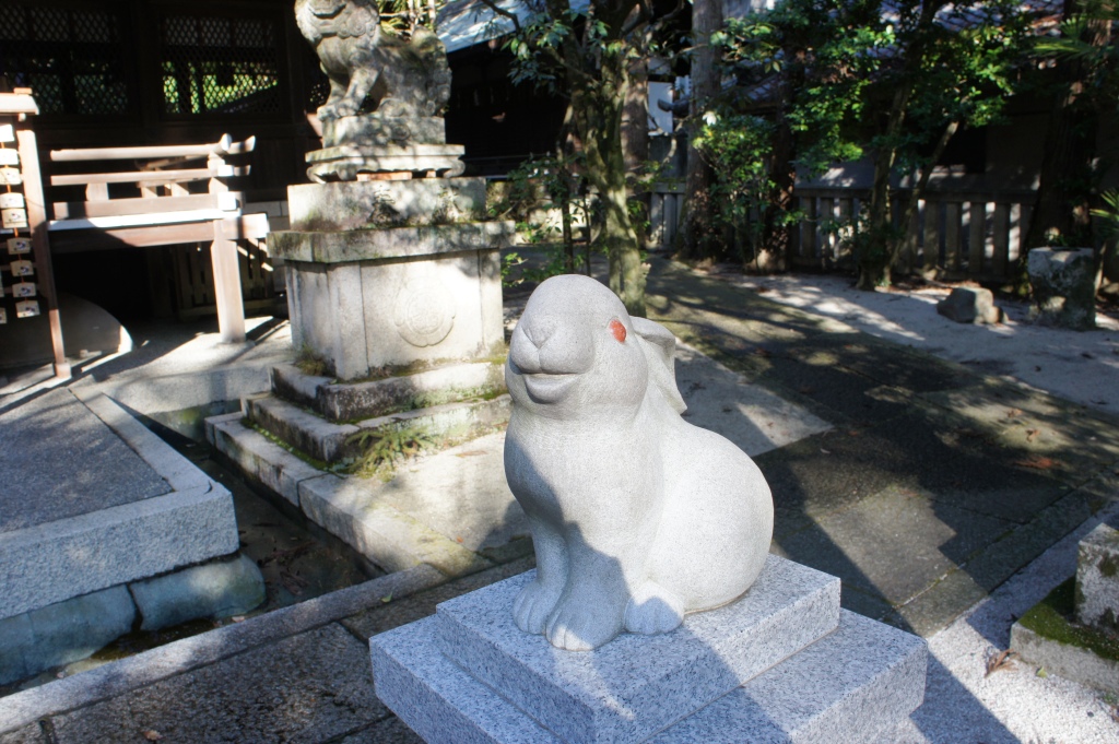 狛犬ならぬ狛ウサギがとっても可愛らしいのが京都の岡崎神社でした。平安神宮から丸太町通りを東に少し歩いたところにありました。鳥居をくぐると正面に伝統的な本殿が見えてきます。楽しいのはこれから。本殿の左右に狛ウサギが鎮座。そばにぶら下げてある提灯にもウサギの絵。さらには招きウサギもあります。本殿右手の絵馬を吊す場所には黒い大きなウサギさん。ウサギが氏神の使いで多産なことから、子授け、安産祈願の神社として古くから慕われているそうです。