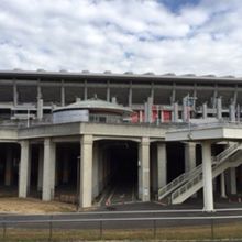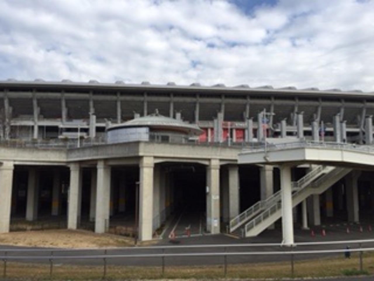 JR小机駅から徒歩7分くらいです。横浜Fマリノスのホームスタジアムですが、サッカー以外にも、いろいろな使われ方をしています。この日は、駅伝大会で外周路を利用していました。また、自転車の耐久レースなども催されます。すごいのは、近くの鶴見川が氾濫しそうになると、一時的な遊水池になる機能もあることです。