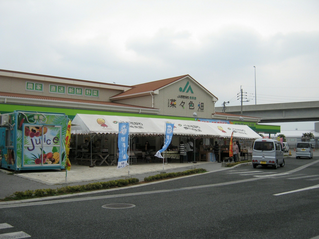 「JAおきなわ食菜館 菜々色畑」は、道の駅「豊崎」の敷地内にあり女性スタッフが中心で運営しています。那覇空港から車で15分くらいで交通の利便性が良い。県内最大のレンタカーステーションのすぐそばで、レンタカー利用時には立ち寄りたいスポットです。地元でとれた新鮮な野菜、果物、お土産品、加工品、精肉などがたくさんそろっています。