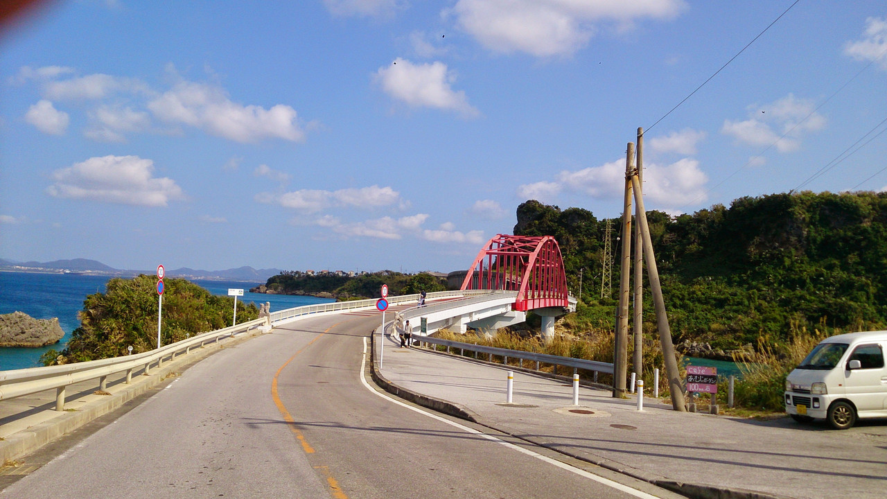 海中道路から道を進み、最奥部の島で正直言って何にもない島で、手付かずの自然とのんびりとした空気がそこに流れている感じです。島の入り口は赤い橋で、ちょうどその橋の両脇にシーサーが設置されており、いかにも沖縄という感じです。