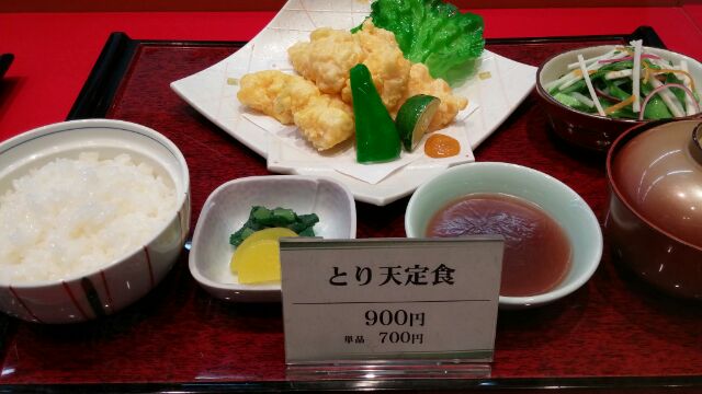 郷土料理をはじめとするファミリーレストランのようなレストランです。せっかくの大分なので、郷土料理のとり天(900円)を注文しました。ごはん、サラダ、お漬物、汁物がついています。鶏は柔らかく、天つゆもおいしかったです。