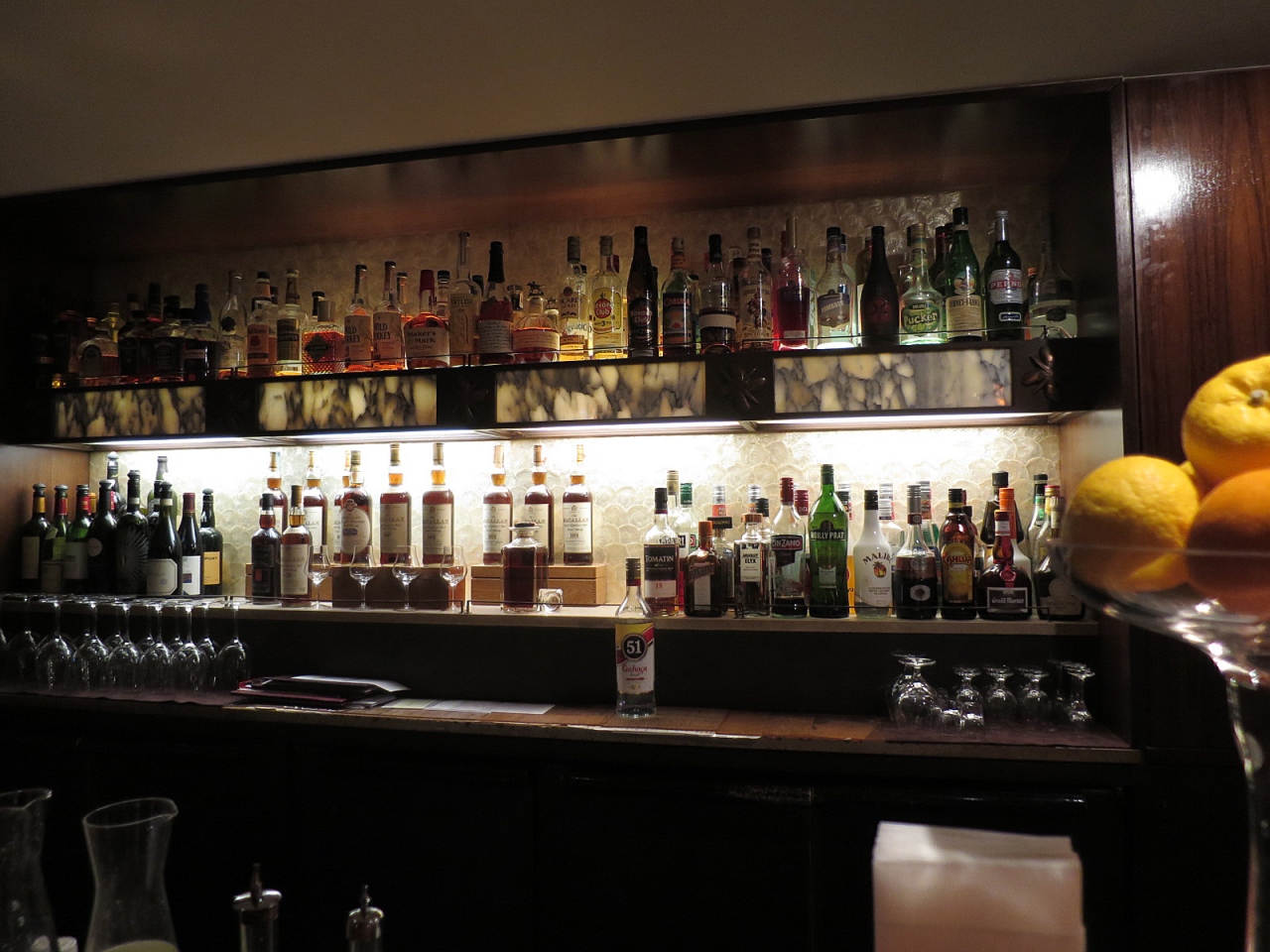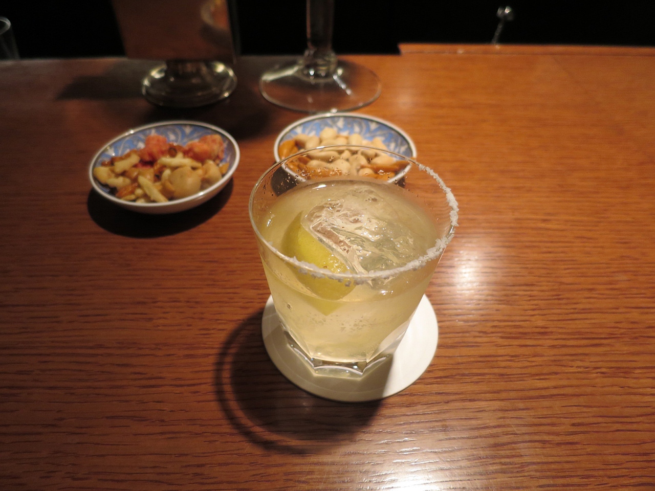 「ホテルオークラ東京」に宿泊時、いただいたウェルカムドリンク券を利用し、食前酒のために訪れました。こちらは「ホテルオークラ東京」のメインバーなのですが、実は今回が初めての利用になりました。本館ロビー階の一角にあるお店に入ると、案内係のスタッフのエスコートでカウンター席に案内されました。店内の造りは、まさにロンドンのアッパー階層用バーのような重厚さで、照明が抑えられた店内にステンドグラスの灯りが映えます。”たとえ二十歳以上であっても、子どもは入場不可”と入口に張り紙がしてあっても驚かない、そんな雰囲気ですから、本当の大人にとっては居心地良いです。