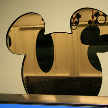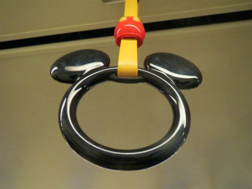 電車の車窓やつり革にミッキーがかたどってあったりして