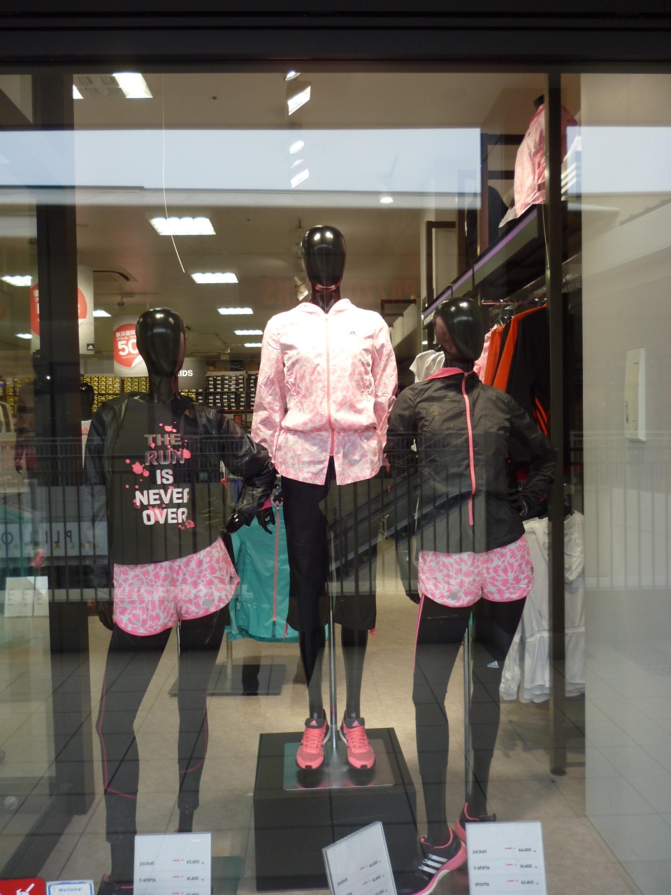 春色のジョギングウェアーが勢ぞろいしていて、春なんだなあと思いました。店内は広くて、レディス、キッズ、メンズとコーナーが分かれていて、買い物がしやすいです。50パーセントオフの商品もありました。ピンクの靴がかわいいです。