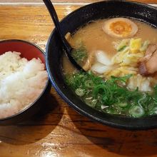 ラーメンは醤油とんこつかとんこつパイタンのどちらか選べます。ご飯も白ご飯か炊き込みご飯かおにぎりか選べます。