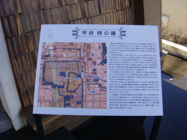 時の鐘は甲府駅北口にある店舗数10軒程度の小さな和風商店街「甲州夢小路」にあります。レンガ造りの鐘楼はで、6階建程度の高さがありますので、遠くからでも目立ちます。この鐘楼は、甲府市民の幸福と甲府市の発展を祈念して、平成25年に建てられました。また鐘の下には押しボタンがあり、誰でも押して鳴らすことが出来ます。