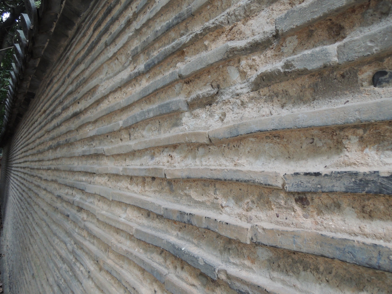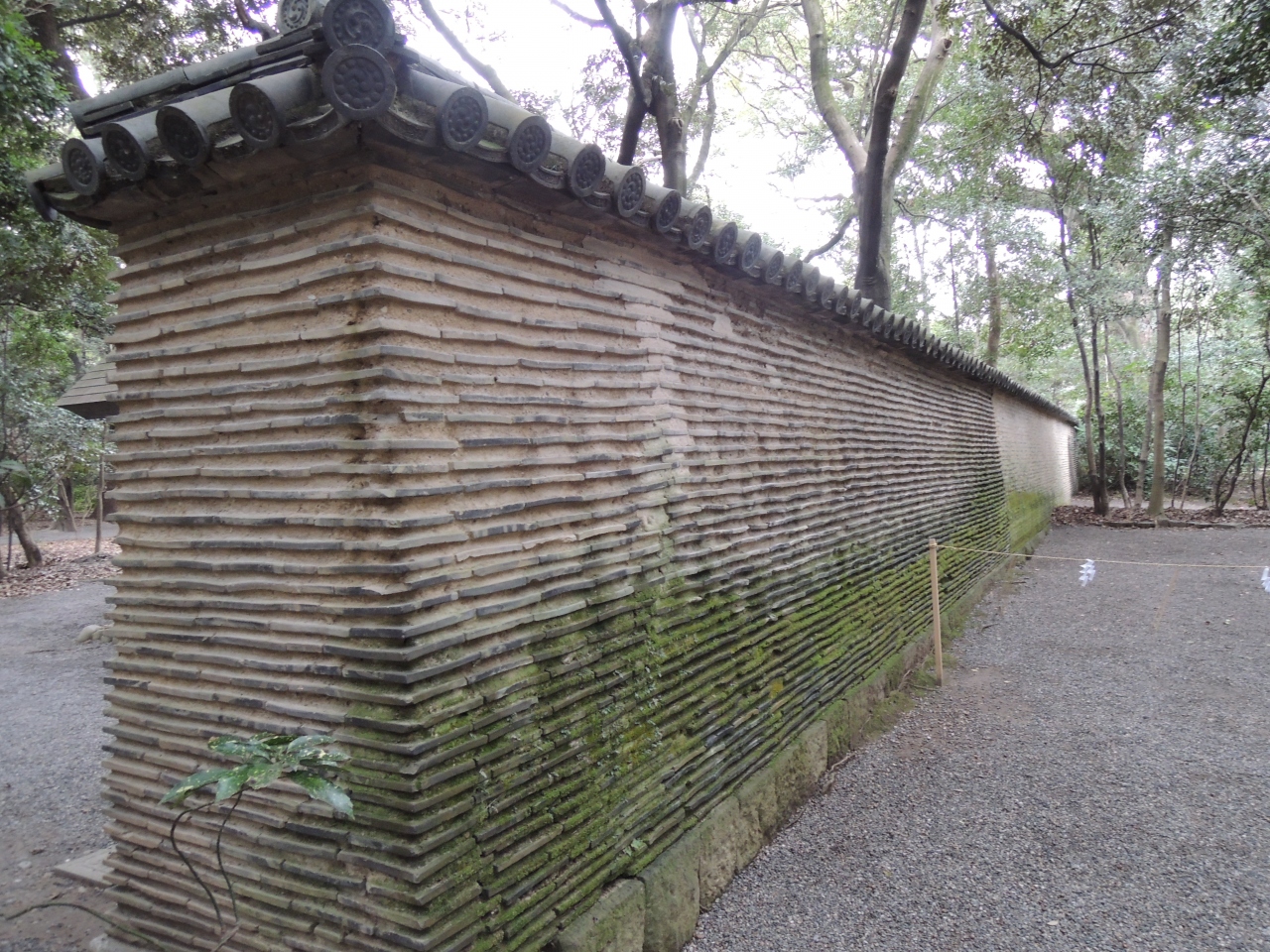 信長塀は土と石灰を油で練り固め、瓦を厚く積み重ねて作られていてとても重厚感があります。