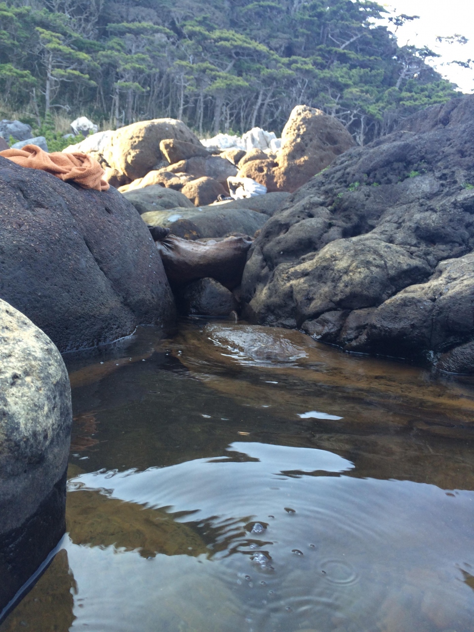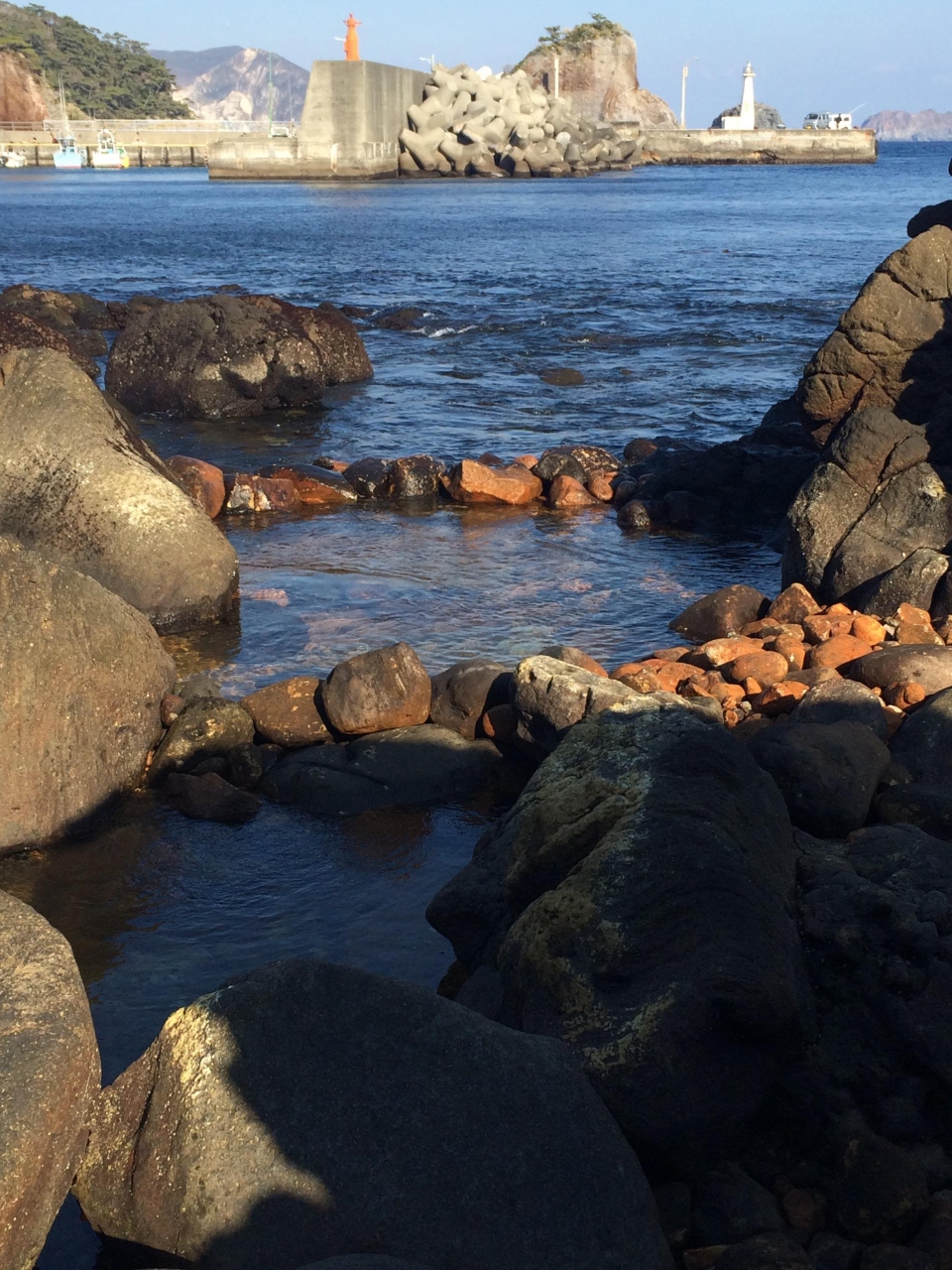 茶色の松が下雅湯から細い小道を進み温泉案内の先の海側に湯だまりがあります