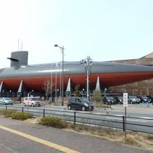 大きな潜水艦がアスファルトの上に立っているというとてもインパクトのある外観をしています。
