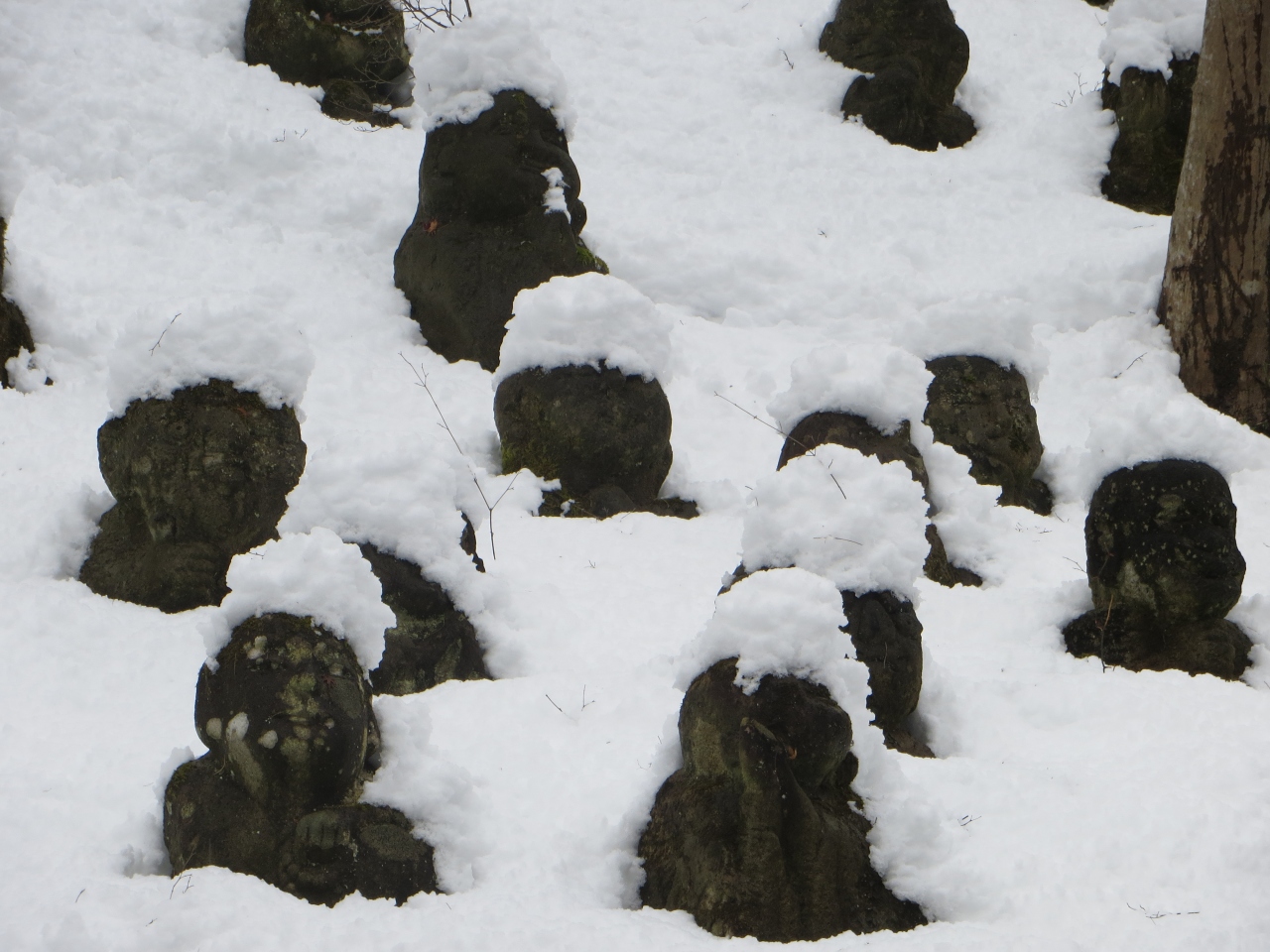 愛宕念仏寺にはたくさんのかわいい羅漢さんがいます。個人が前の住職の指導を受けながら一つ一つ掘ったそうです。年初に京都では雪がけっこう降りました。嵐山と嵯峨野一帯は雪景色。愛宕念仏寺の羅漢さんの頭にもたくさんの雪が降り積もっていました。四季が楽しめるお寺です。