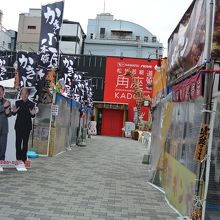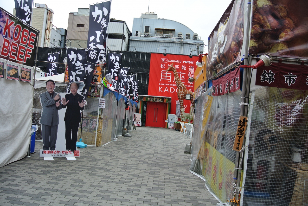 一応角座ということで、奥に赤い建物がありましたが、手前の広場にはテントの食べ物屋さんがいくつも並んでいます。松竹芸能所属の芸人さんの等身大パネルも置いてありました。全体的に作りもちゃちで、とりあえずやっている・・という感じでした。