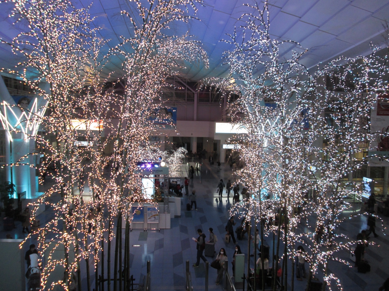 国際線ターミナルでは毎年恒例のスカイイルミネーションの飾りになりました。2014年度は11/7から来年2/15まで開催するようです。きれいな電飾を見ながら出国しました。普段は和を感じるターミナルですが、クリスマスの雰囲気になりました。