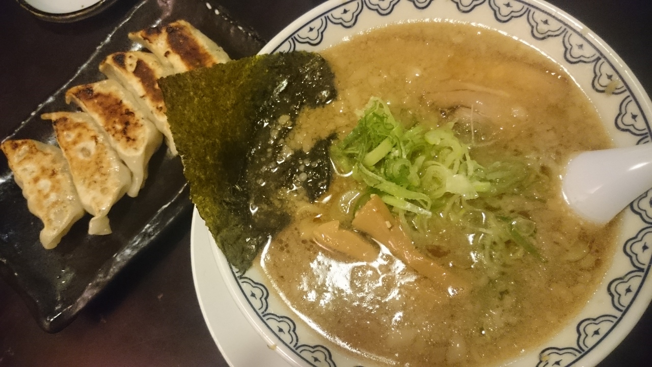 魚介の香りが強い豚骨ラーメンです。スープの表面にはギッシリと背油が浮いてます。味わいは見た目よりもクドくないのですが、油パワーですぐにお腹いっぱいになってしまいました。餃子も食べてみましたが、ラーメンがこってりすぎて餃子が野菜餃子のように感じました。