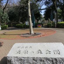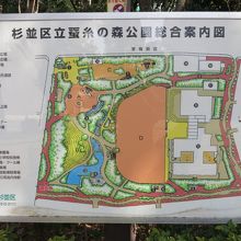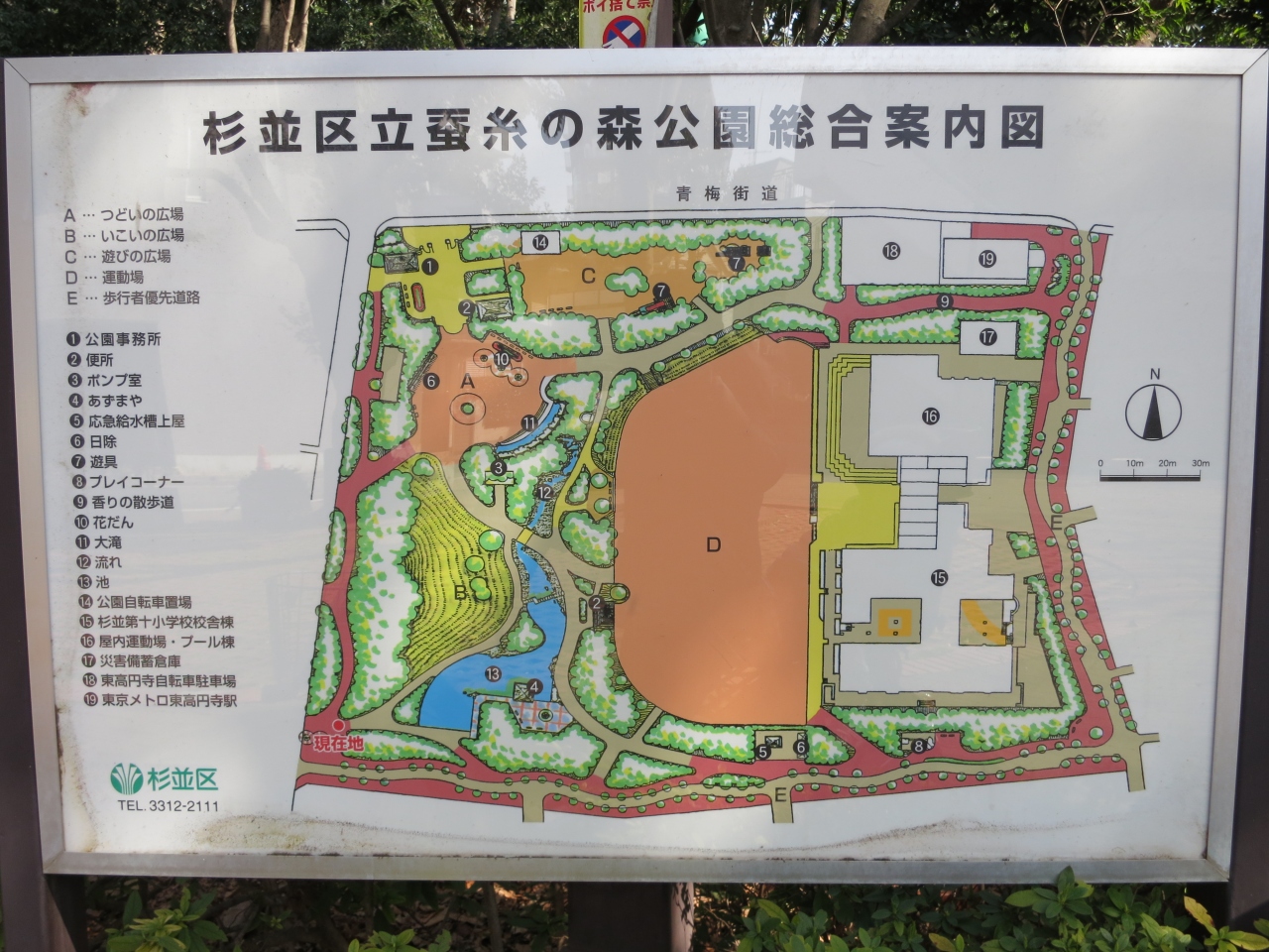 環七通りと青梅街道の交差点近くにある、明治44(1911)年に創設された蚕糸試験場の跡地に出来た区立公園です。園内には蚕糸科学技術発祥の地の石碑があり、旧正門や衛所が残っています。園内には、運動場や遊びの広場(遊具あり)、いこいの広場、つどいの広場などがあり、大滝や散歩道、花壇などもあって、区民の憩いの場となっています。週末の午前中に子どもたちと行きましたが、遊びの広場は小さな子ども連れの家族でにぎわっていました。