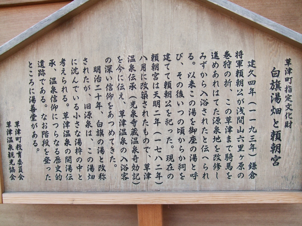 源頼朝が浅間で狩りをした時に、草津に寄った時に入浴したことで、ここに祀ってあります。「白旗の湯」の由来は、源氏の旗の白旗です。その白旗の湯が沸く場所に、小さな石宮を作って頼朝を祀っています。
