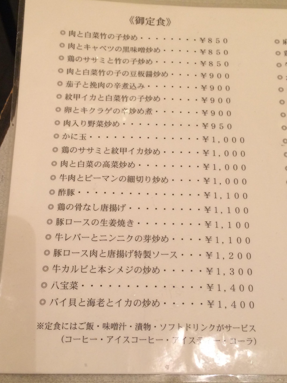 800円から20種類以上の中華定食があり、ご飯にスープでは無く味噌汁というのがいい。