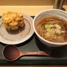 そばと天ぷらは別皿で提供されます。汁が油でいっぱいにならないのがいいですね。冷たいそば同様、温かいそばも「駅そばクオリティ」ではありません。
