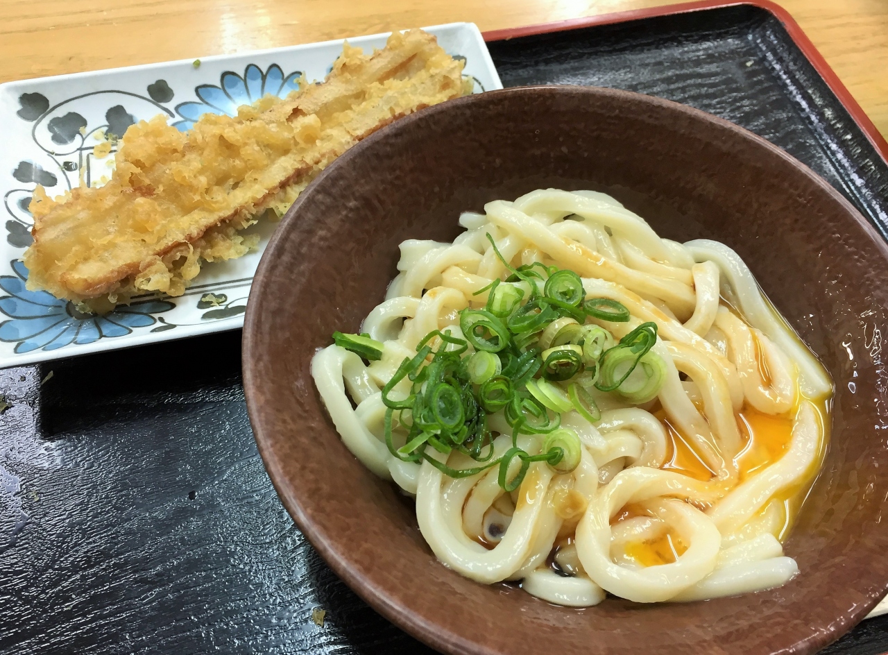 かま玉とちくわ天をチョイスしました、モチモチで美味しいおうどんでした。