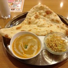 ランチセットを注文。チキンカレー、ナン、サラダ、ラッシーで、ナンはおかわりできます。