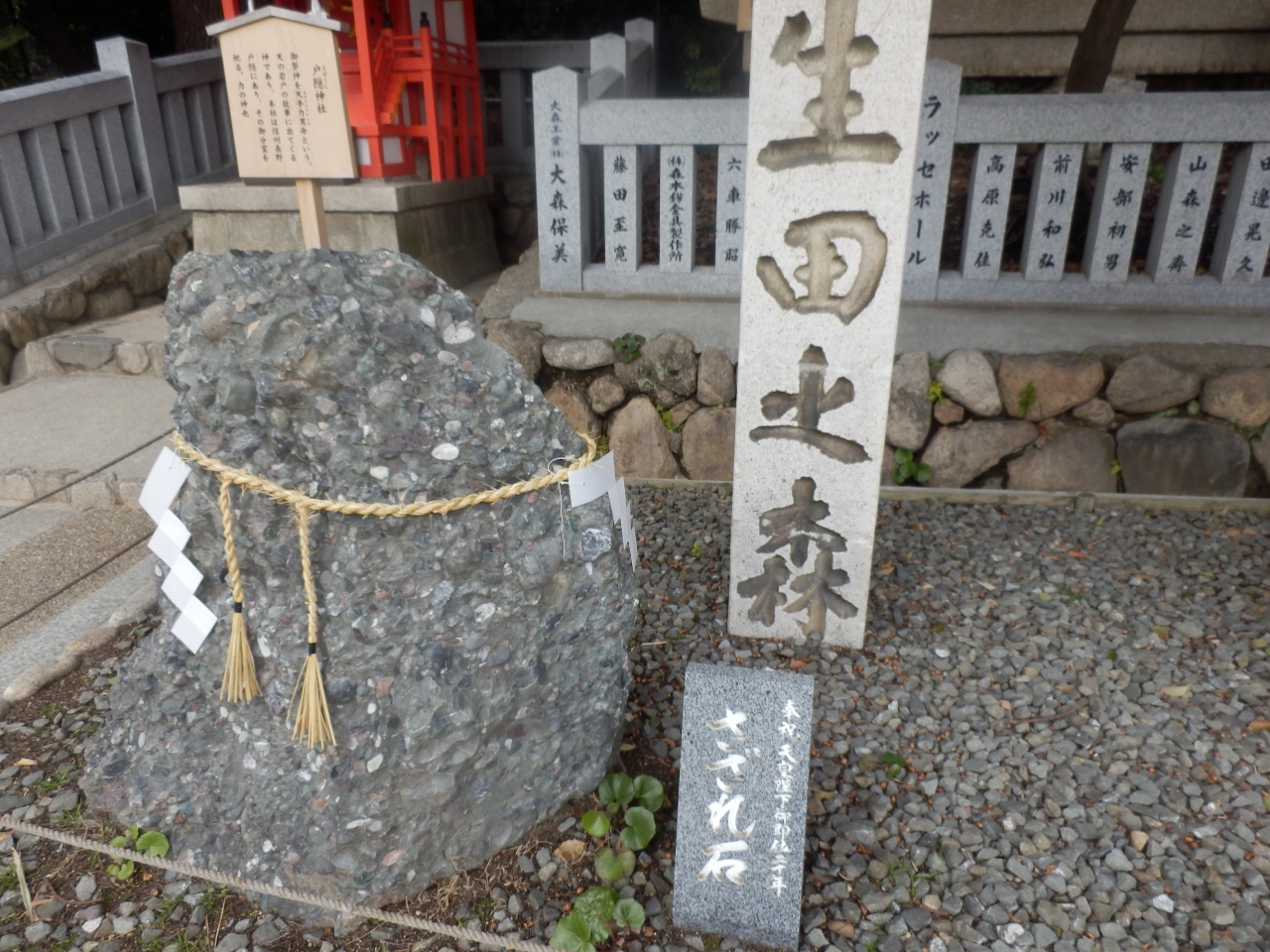 今年の初詣は、神戸の生田神社へ参拝した、生田さんの本殿裏側に、さざれ石と表示された石がありました、いままで見逃していた石、一メートル程度のややまるっこい石、ちゃんとしめ縄がまかれていたのは、さすが神社の境内にあるからでしょう、さざれ石とは小さな石が長期間を経て塊り大きくなった石のことだそうです、小生初めて知ったです.国歌の君が代にうたわれているさざれ石も同じ意味だそうだ、