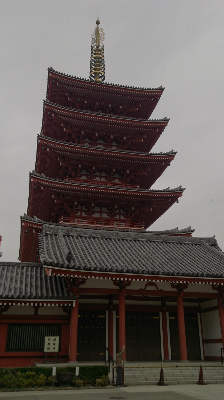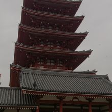 浅草寺の境内にある立派な塔。戦後再建されているため鉄筋コンクリート造の建物のようですが、朱色に塗られた塔はちょっと派手ですが浅草寺境内では圧倒的な存在感がある建物の一つです。遠くでみるとさほど大きくない感じですが近寄ると結構な高さの大きな塔です。