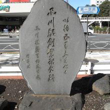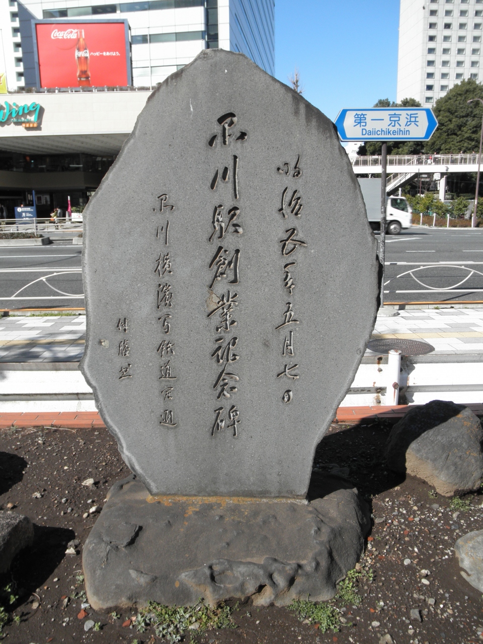 品川駅の高輪口を出てタクシー乗り場から第一京浜の方を見るとありました。歩道とタクシー乗り場の奥の駐車スペースの間に有りますが、表は駐車スペース側にあるのでタクシーに気をつけて近づいて下さい。碑の横には碑に何が彫ってあるのかを書いたプレートがあり、良く解りました。