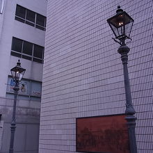 当時を復元したガス灯が碑の両側に立っています。
